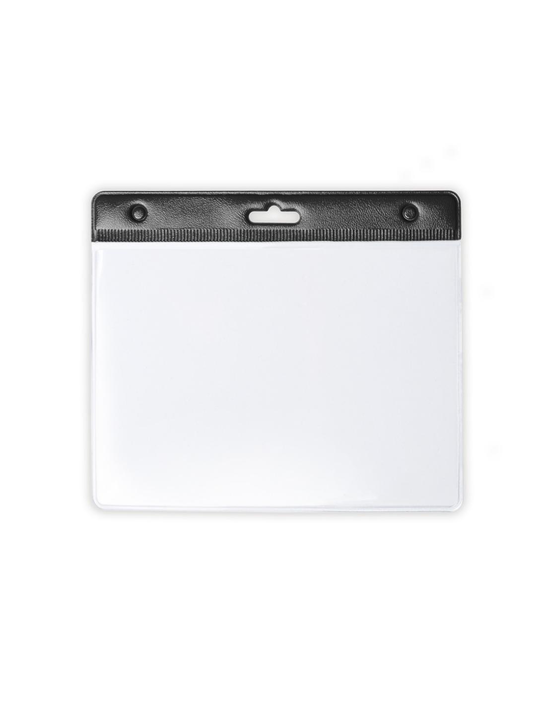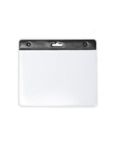 Identificador troquelado en PVC con cabecera en variados colores, ventana frontal transparente y parte trasera transparente.