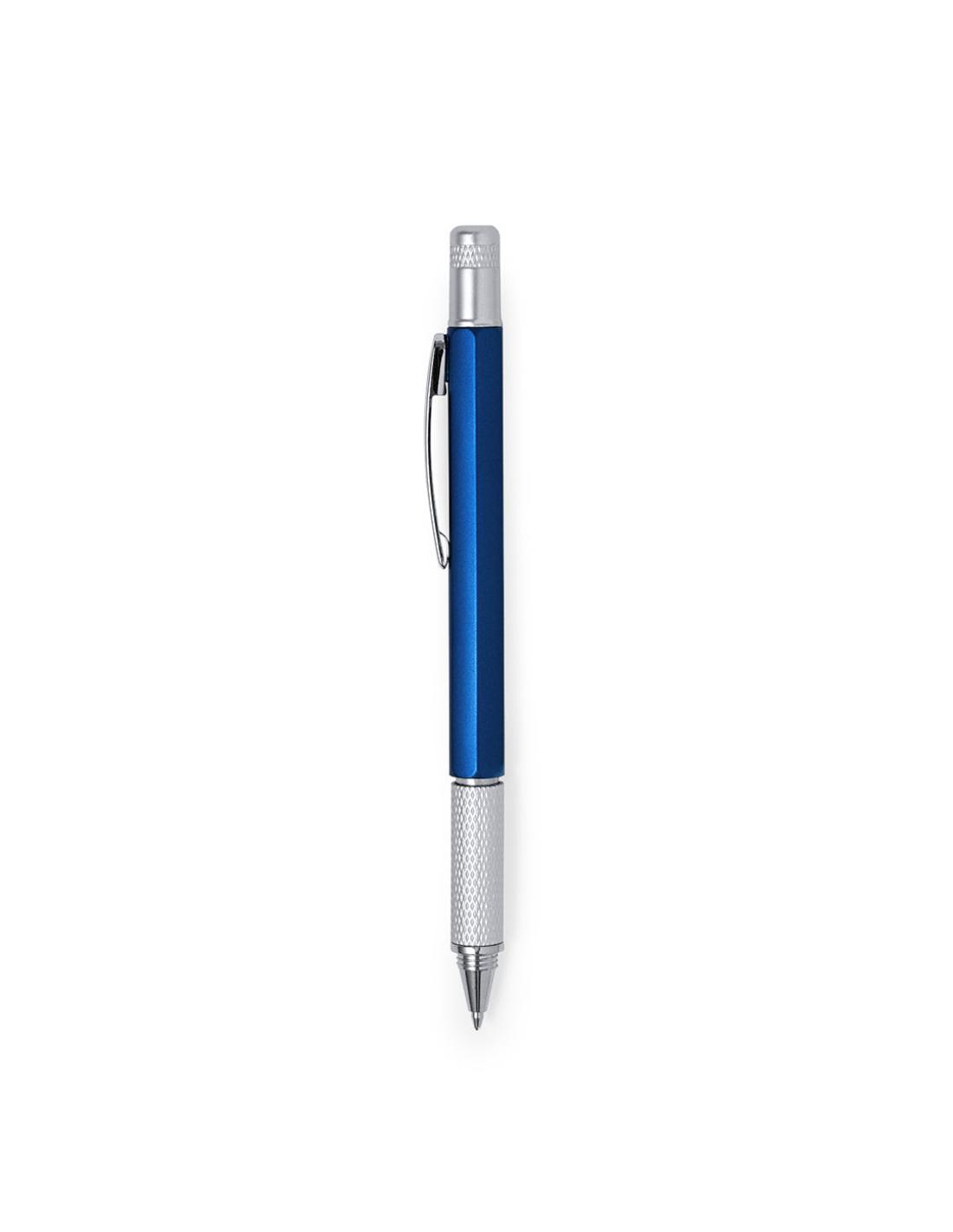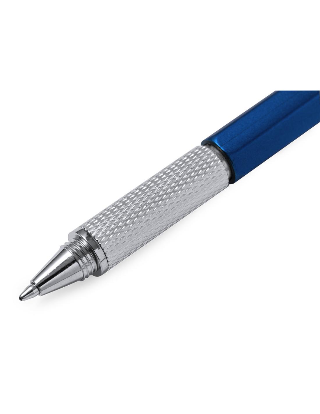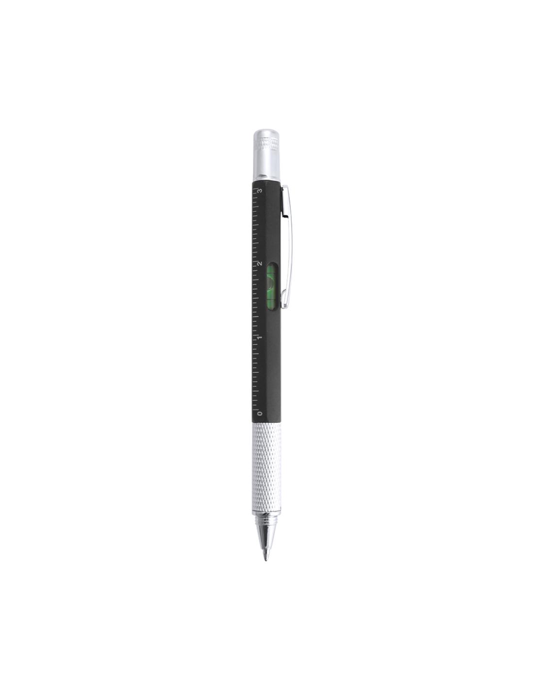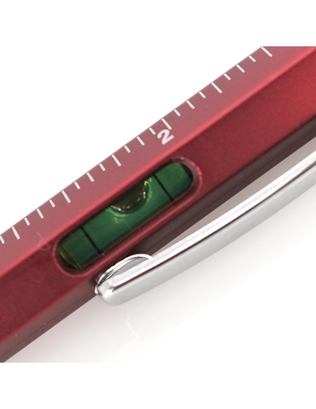 Bolígrafo multiherramienta 4 en 1 de mecanismo giratorio, en variados colores y con suave empuñadura. Con nivel integrado en cuerpo, regla con sistema métrico en centímetros/pulgadas y destornillador de doble cabeza -plana y de estrella-. Con clip metálico y tinta azul.