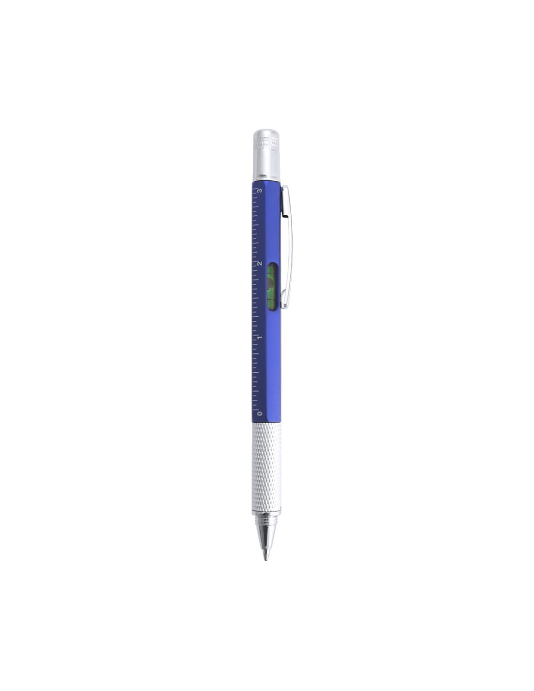 Bolígrafo multiherramienta 4 en 1 de mecanismo giratorio, en variados colores y con suave empuñadura. Con nivel integrado en cuerpo, regla con sistema métrico en centímetros/pulgadas y destornillador de doble cabeza -plana y de estrella-. Con clip metálico y tinta azul.
