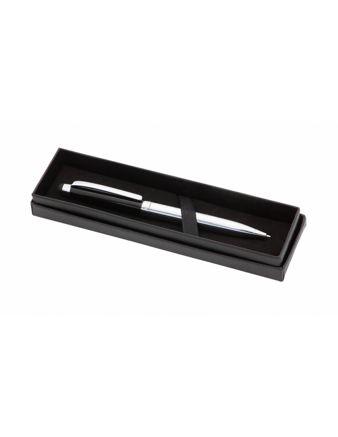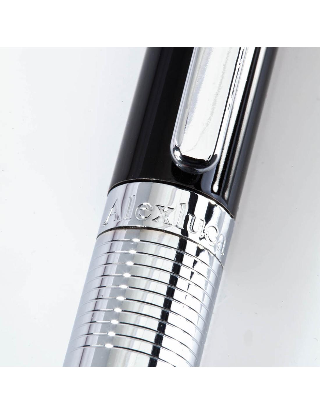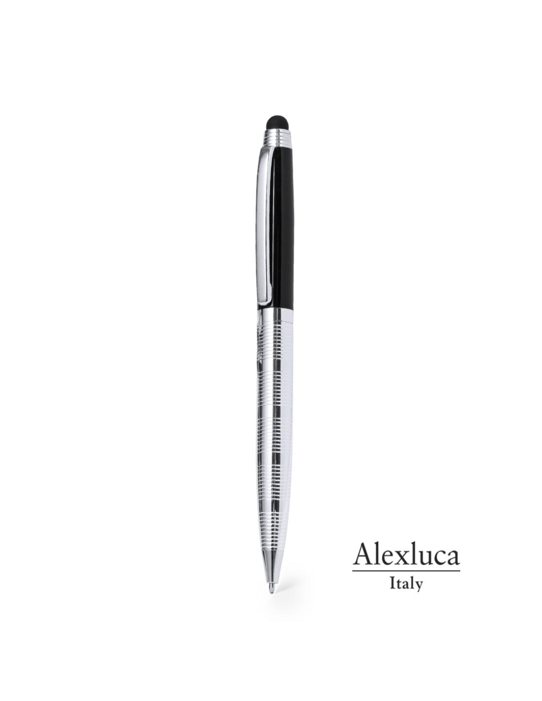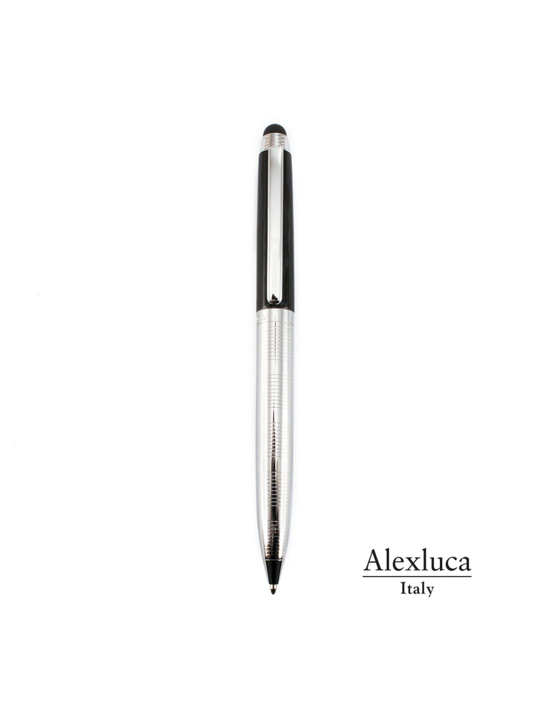 Bolígrafo puntero de Alexluca de mecanismo giratorio con suave cuerpo metálico, de elegante combinación de colores en plateado y negro. Clip y empuñadura de diseño a juego. Presentado en estuche individual negro con logotipo de la marca. Tinta azul.