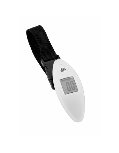 Práctica báscula digital para equipaje en vivos colores. Con pila de botón incluida y peso máximo de 40kg.