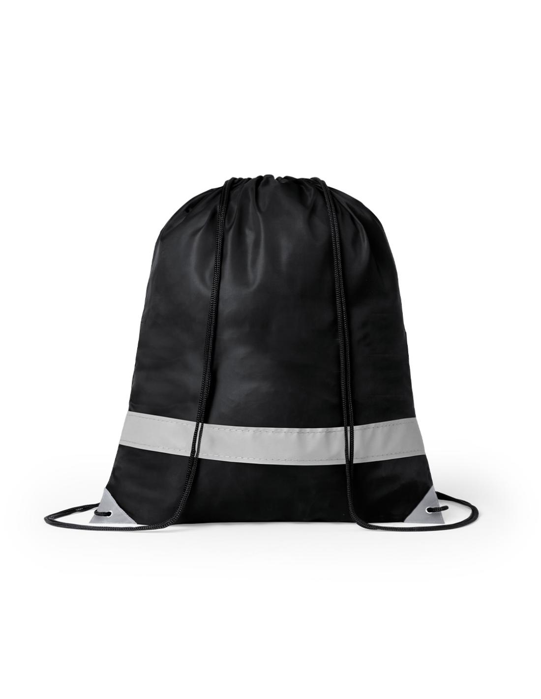 Mochila reflectante en suave poliéster 190T de alegres colores, con tira frontal reflectante. Cuerdas autocierre en color negro y esquinas reflectantes reforzadas con argollas metálicas.