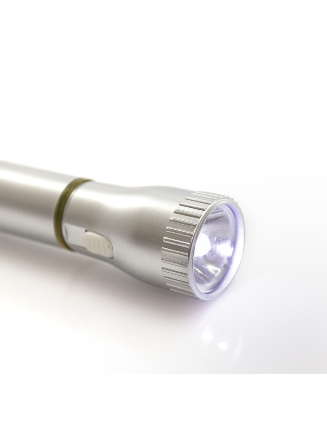 Boligrafo con linterna led integrada. De original diseño bicolor y cuerpo en suave acabado de color plateado. Capucha translúcida en vivos colores con cinta de transporte a juego. En tinta azul y con pilas de botón incluidas.