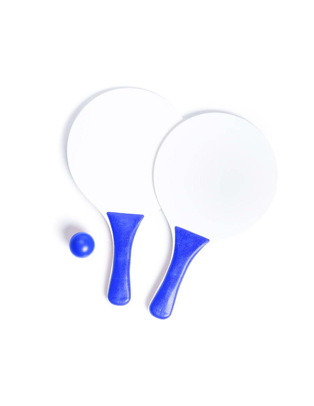 Par de palas de playa en madera natural con mango reforzado en variada gama de vivos colores. Presentadas en bolsa redecilla con pelota a juego.