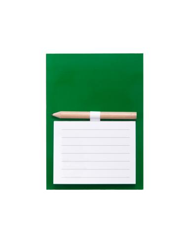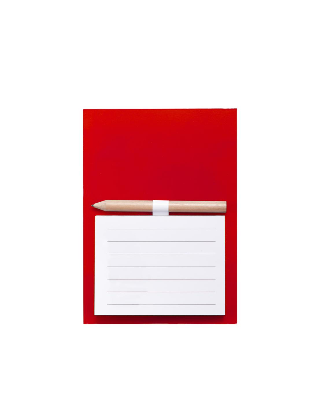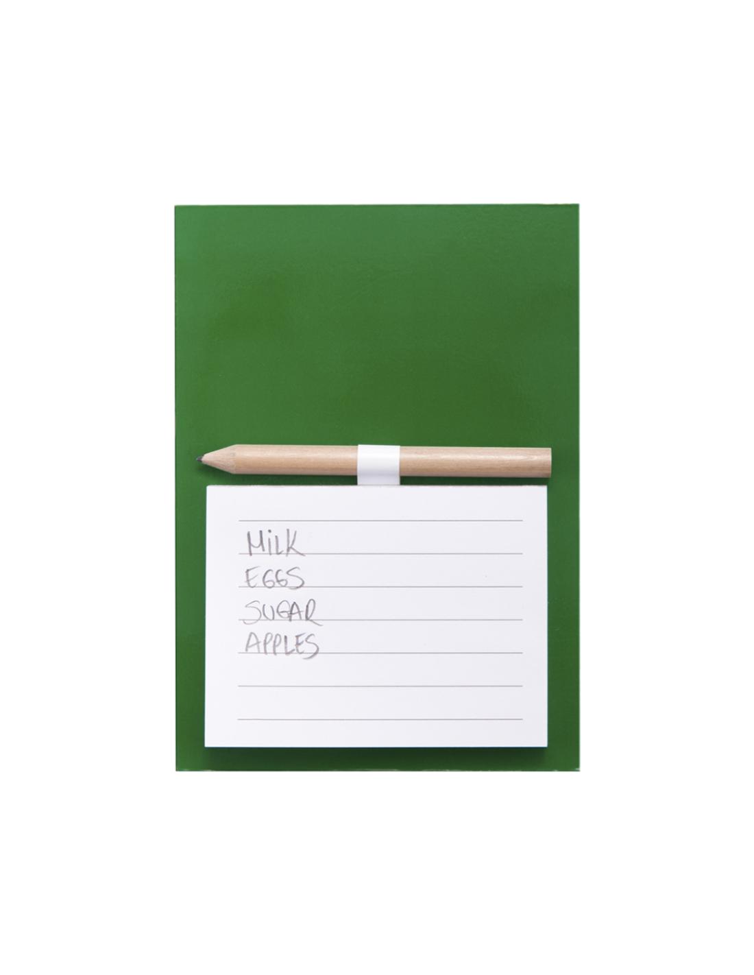 Imán bloc de notas en resistente cartón de vivos y variados colores. Bloc de 40 hojas de distribución a una raya con soporte para minilápiz -incluido-.