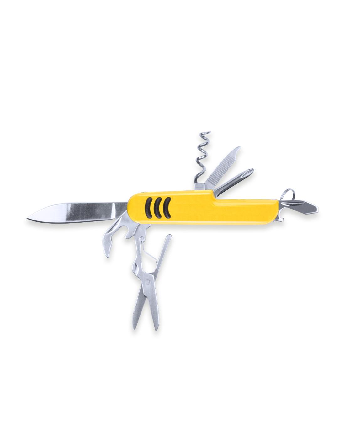 Navaja multiusos con accesorios de acero inox de 9 funciones y mango con accesorio anideslizante en vivos colores. Presentada en caja individual.