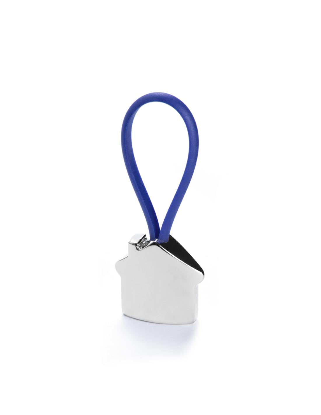 Llavero metálico en divertido diseño 3D de casa. Con cinta de goma en variados y vivos colores.