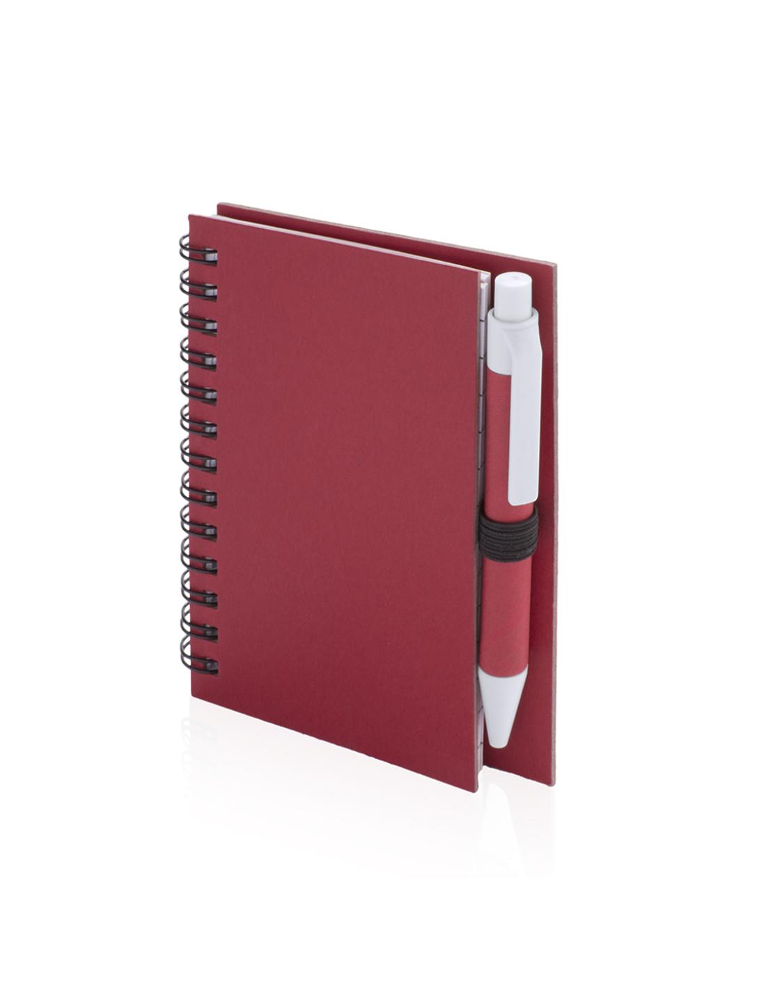 Libreta de anillas con tapas de suave tacto acabadas en resistente cartón reciclado y bolígrafo en cartón reciclado a juego. De atrevidos colores, 50 hojas con distribución a una raya y con soporte para bolígrafo en contraportada.