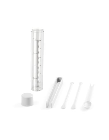 Set para cocktails de 5 accesorios en variada gama de vivos colores. Incluye envase medidor de 60ml de capacidad, cuchara trinchador, pinzas y dos agitadores.