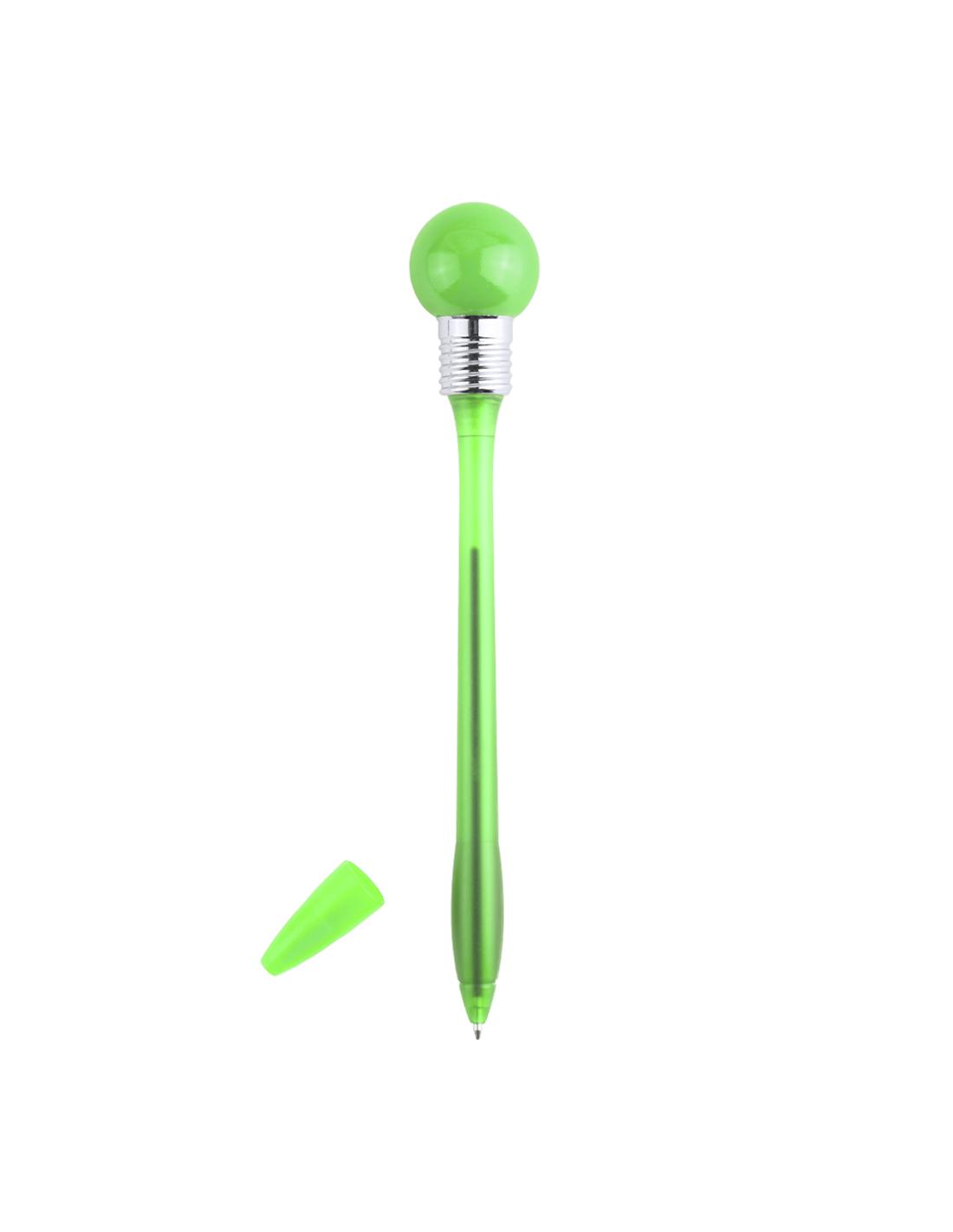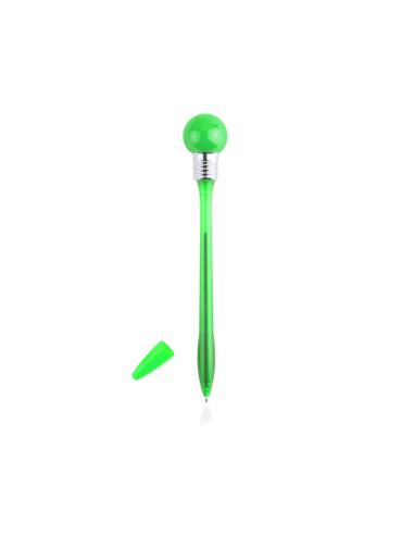 Divertido bolígrafo bombilla con cuerpo de suave acabado en vivos colores transparentes. Con linterna esférica de goma con luz a juego que se activa dejando caer el bolígrafo en una superficie dura. Capucha a juego y en tinta azul.