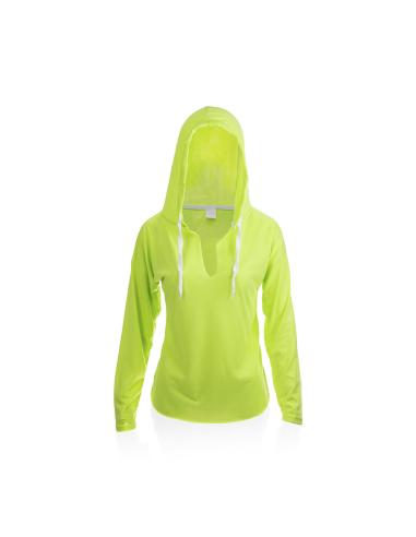 Original camiseta de manga larga en diseño unisex. En combinación de materiales algodón/poliéster de 160g/m2, con capucha y cierre ajustable de cordón. En variada gama de vivos colores y versión en amarillo fluorescente. Disponible en tallas S, M, L, XL.