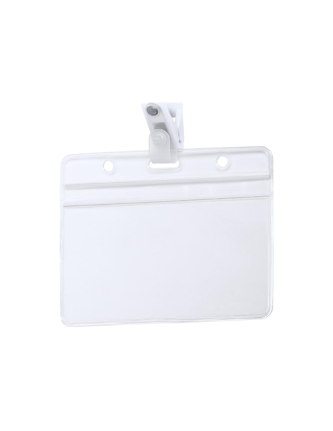 Identificador troquelado en PVC con clip de fijación en color blanco. Disponible en diseño horizontal y vertical.