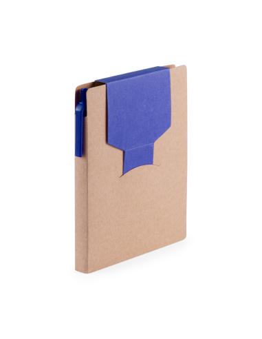 Bloc de notas adhesivas con bolígrafo de cartón reciclado a juego incluido. De original diseño bicolor, tapas de suave tacto con autocierre de tira en parte superior a juego y acabadas en resistente cartón reciclado rígido. Con soporte para el bolígrafo integrado en lomo, 70 hojas lisas, 25 notas adhesivas grandes, 25 medianas y 100 mini notas adhesivas.