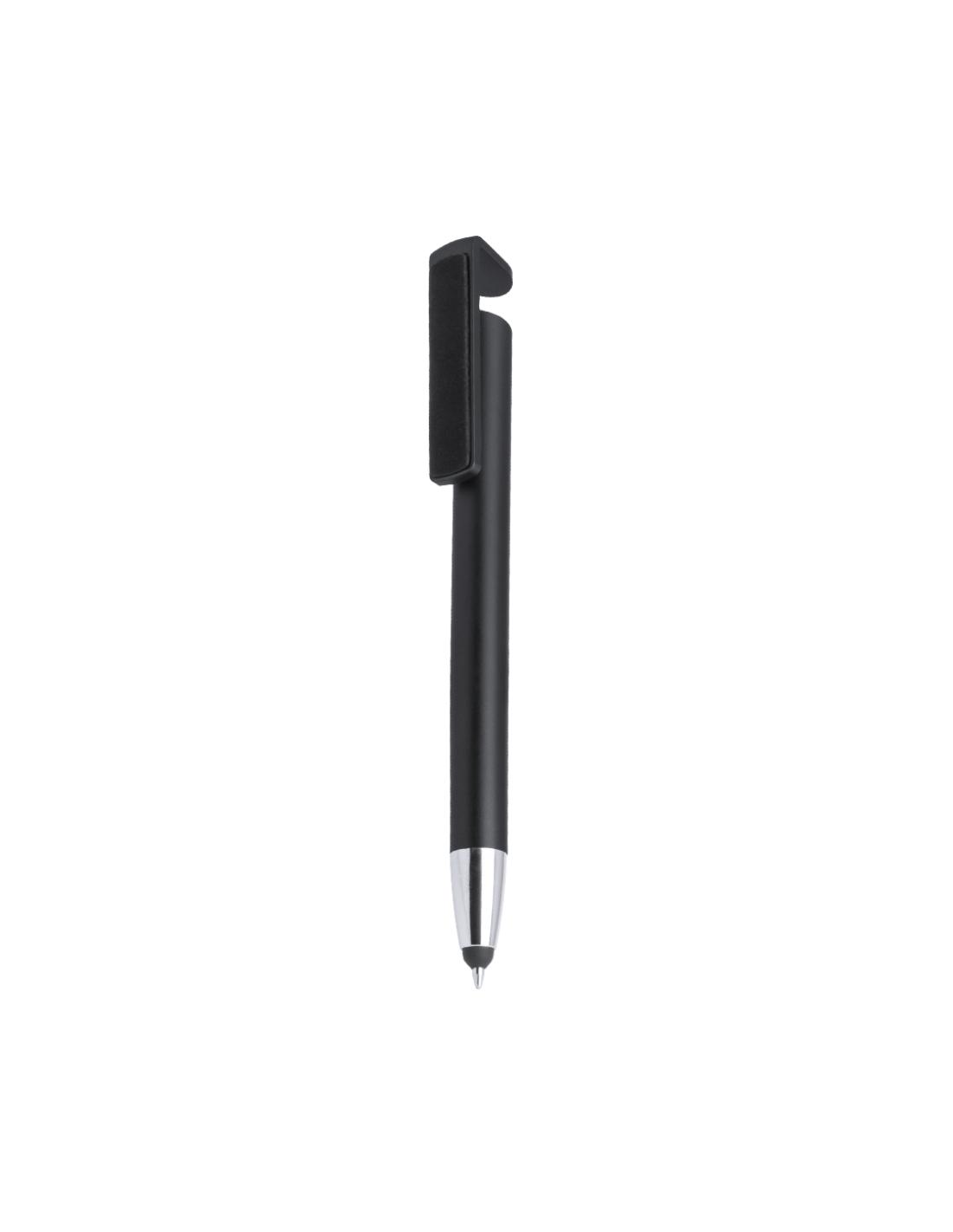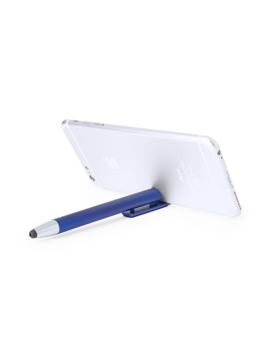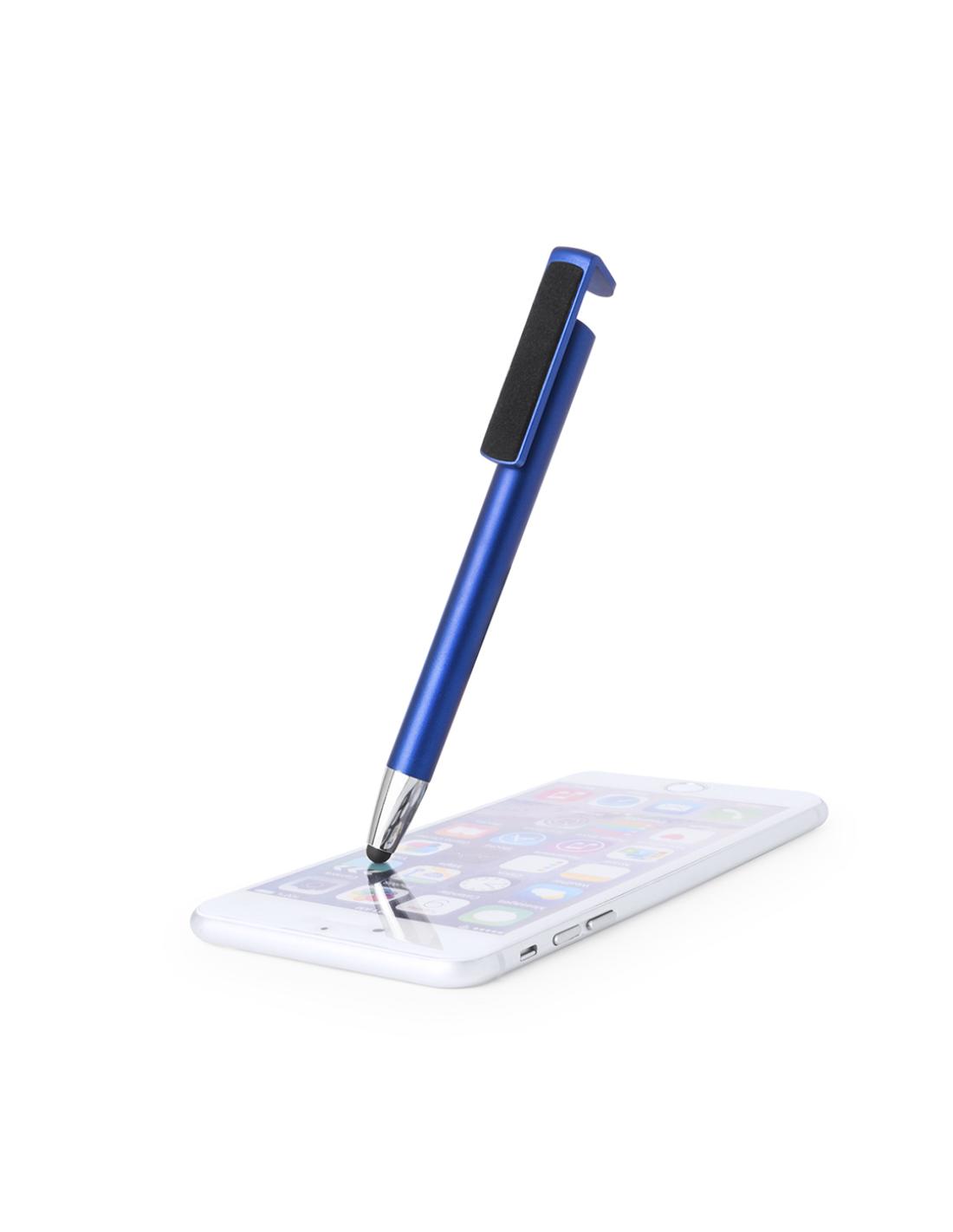 Bolígrafo puntero multifunción de mecanismo pulsador en desenfadados colores y con clip de doble función especialmente diseñado para servir como soporte para dispositivo móvil y también como limpiador de pantalla. Con cuerpo en acabado metalizado, especialmente diseñado para marcaje en tampografía y tinta negra.