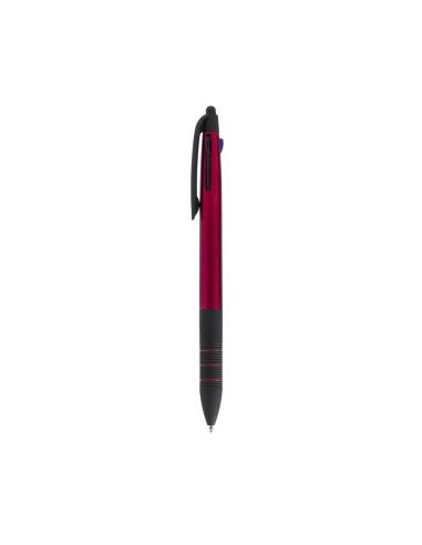 Bolígrafo puntero 3 en 1 de mecanismo pulsador retráctil, de actual diseño y cuerpo de suave acabado metalizado en vivos colores. Con accesorios en negro y suave empuñadura ergonómica en color negro con anillas a juego. De 3 cartuchos en tintas azul, roja y negra.
