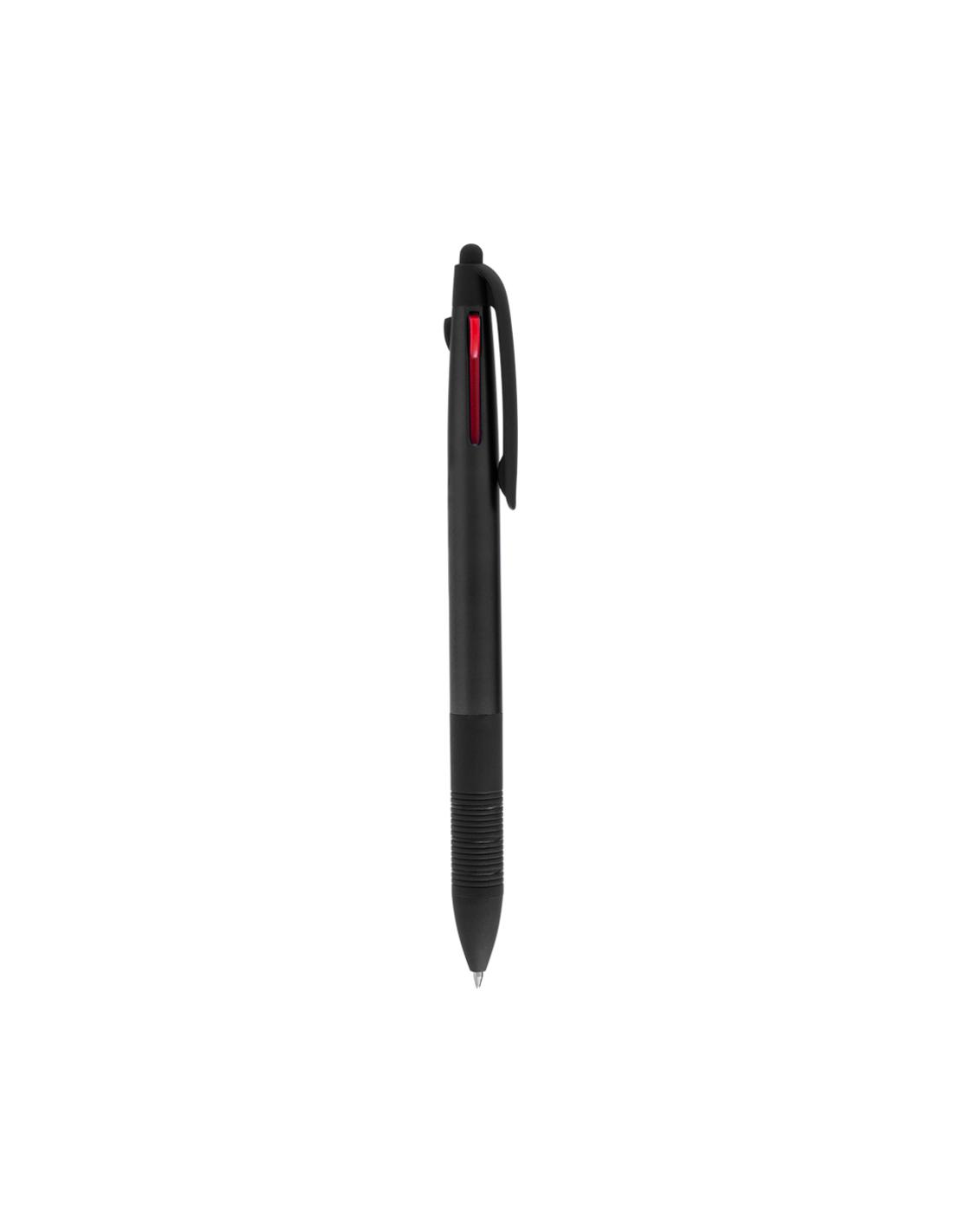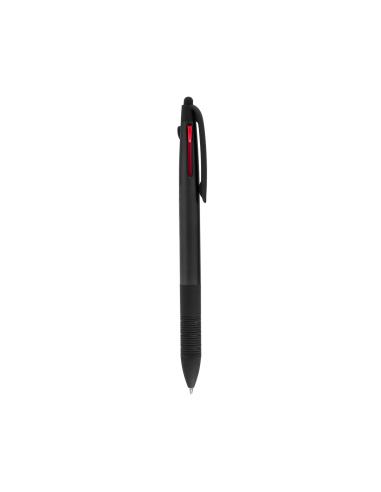 Bolígrafo puntero 3 en 1 de mecanismo pulsador retráctil, de actual diseño y cuerpo de suave acabado metalizado en vivos colores. Con accesorios en negro y suave empuñadura ergonómica en color negro con anillas a juego. De 3 cartuchos en tintas azul, roja y negra.