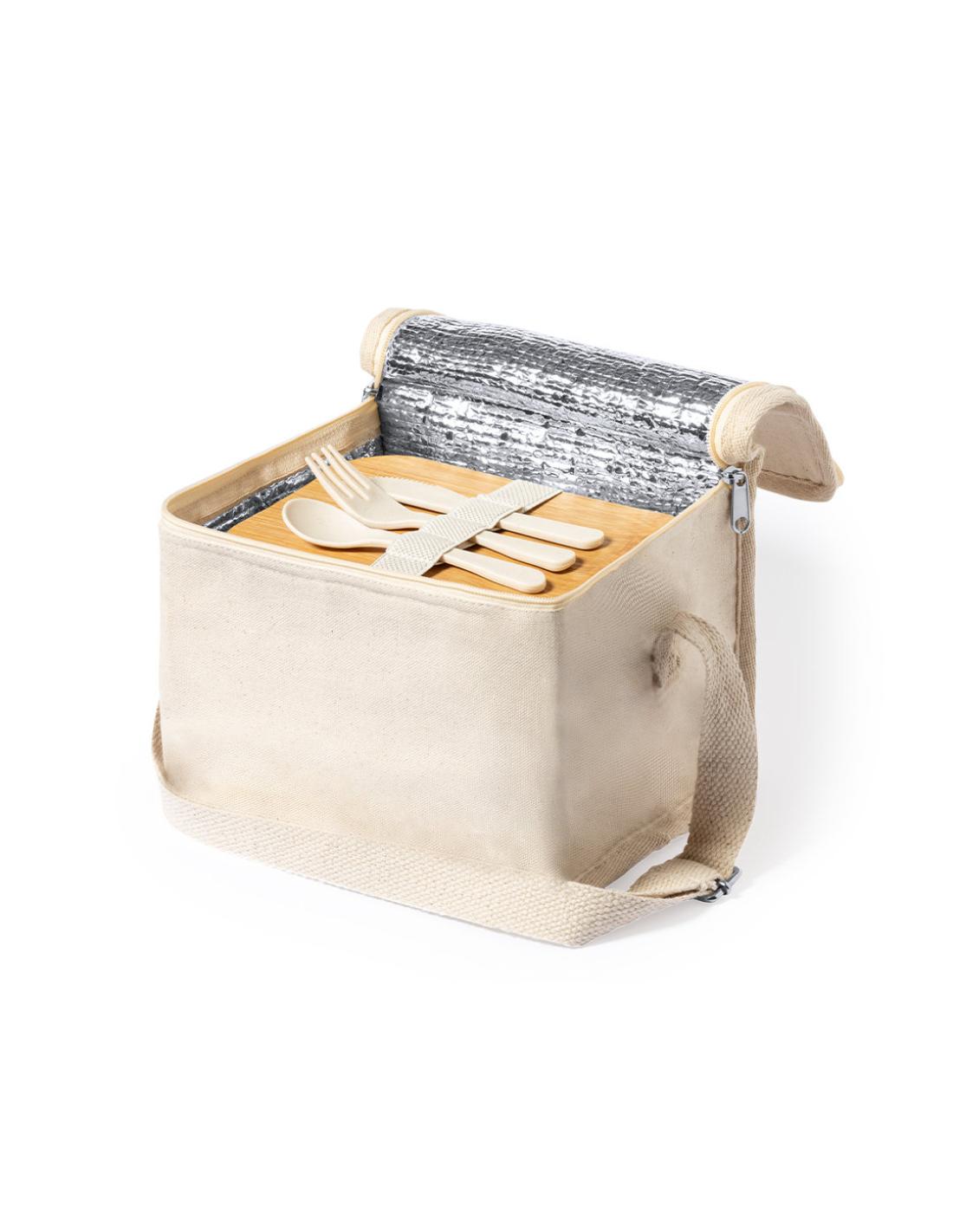 Set de fiambrera y nevera de línea nature con Certificación Food Grade, garantizando la seguridad cuando los alimentos entran en contacto con el material usado para fabricar el producto. Incluye:Nevera fabricada en material 100% algodón, con interior isotermo acabado en aluminio. Cierre de cremallera con doble tirador de cordón y asa de transporte a juego.Fiambrera fabricada en PP veteado libre de BPA, con tapa de bambú y 1l de capacidad. Cierre de cinta elástica de seguridad, con compartimentos para tenedor, cuchara y cuchillo (incluidos).