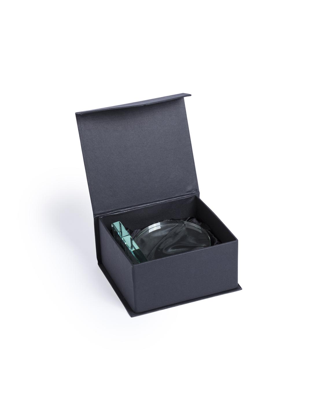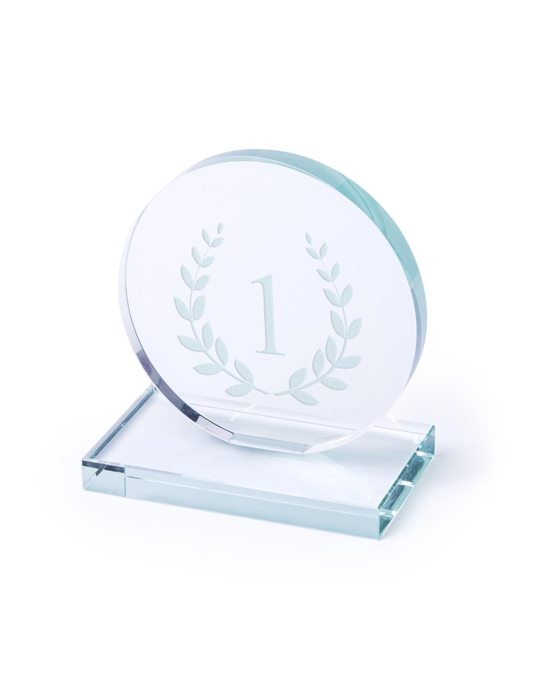 Placa trofeo de grueso cristal con elegante diseño circular y base cuadrada. Especialmente diseñada para marcaje a láser y presentada en estuche de protección individual.