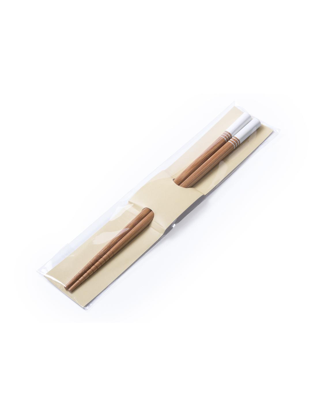 Set de 2 palillos de bambú de fino acabado con accesorios en sobrios colores. Presentados en funda individual de cartón con troquelado.
