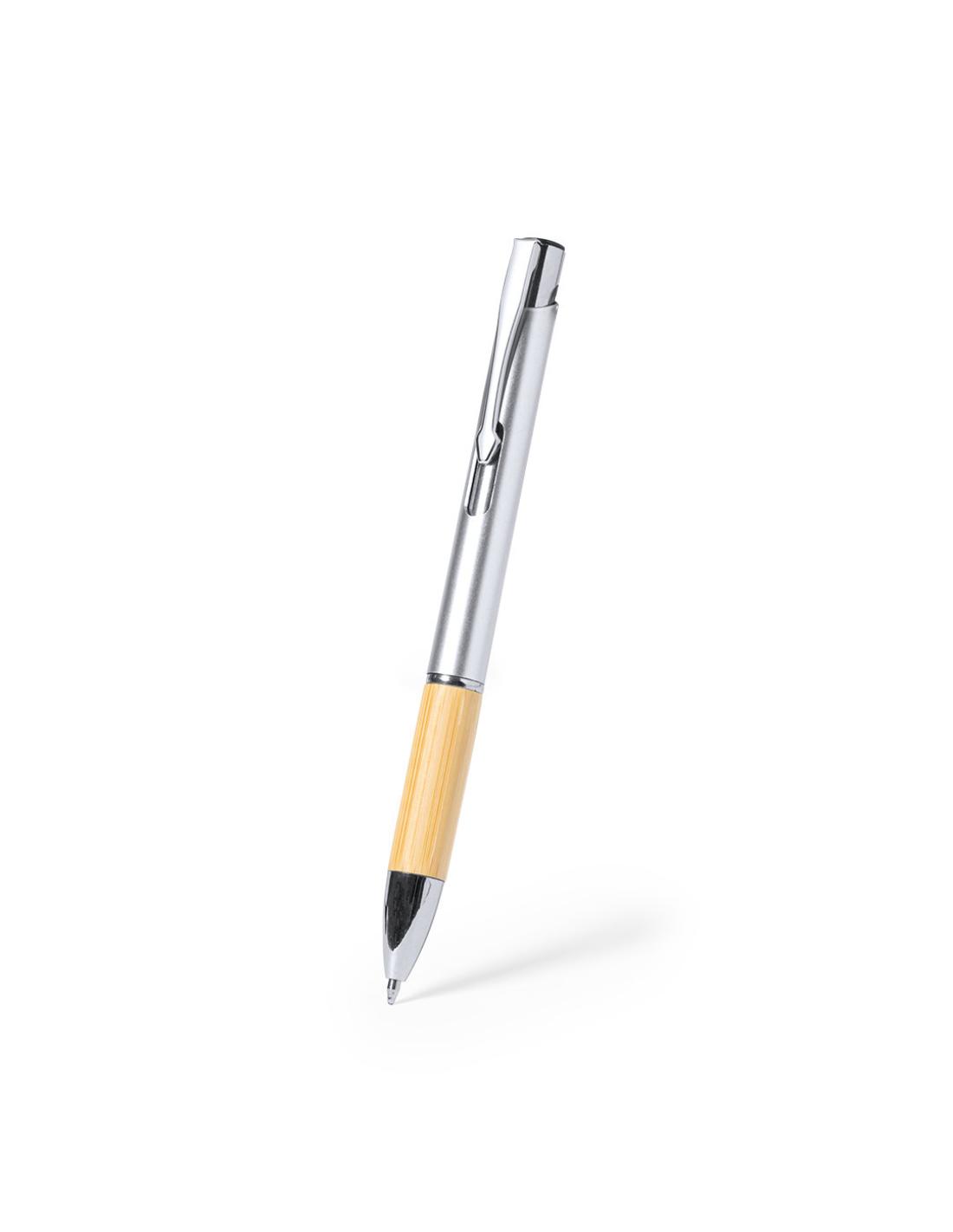 Elegante bolígrafo de línea nature y mecanismo pulsador. Cuerpo en resistente ABS de acabado brillo y empuñadura en bambú, con accesorios a juego. Clip metálico, con cartucho jumbo y en tinta azul.