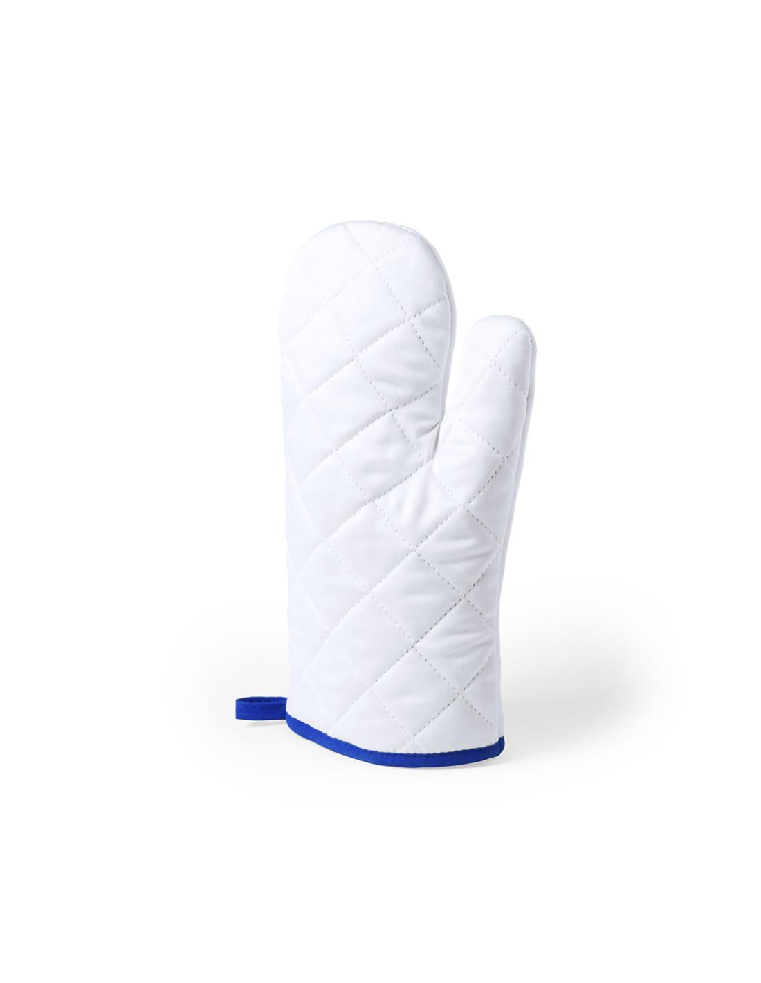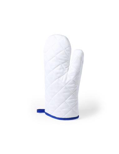 Manopla de cocina en suave material 100% poliéster de suave acabado en color blanco y con bordes en vivos colores. Con una cara lisa especialmente diseñada para sublimación y cinta para colgar.