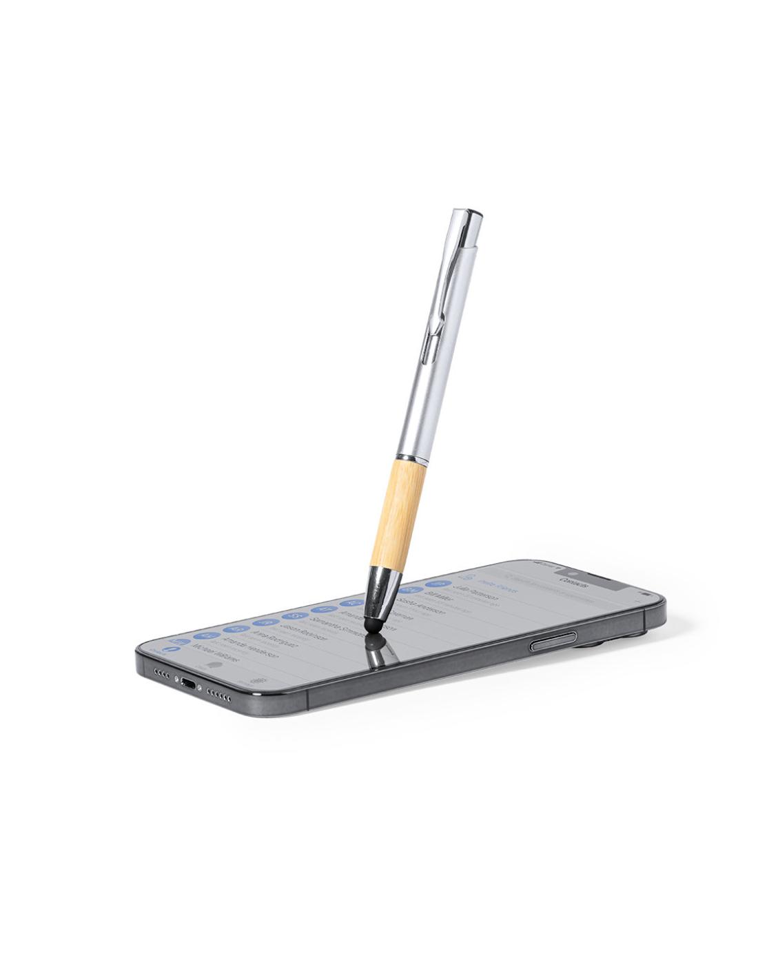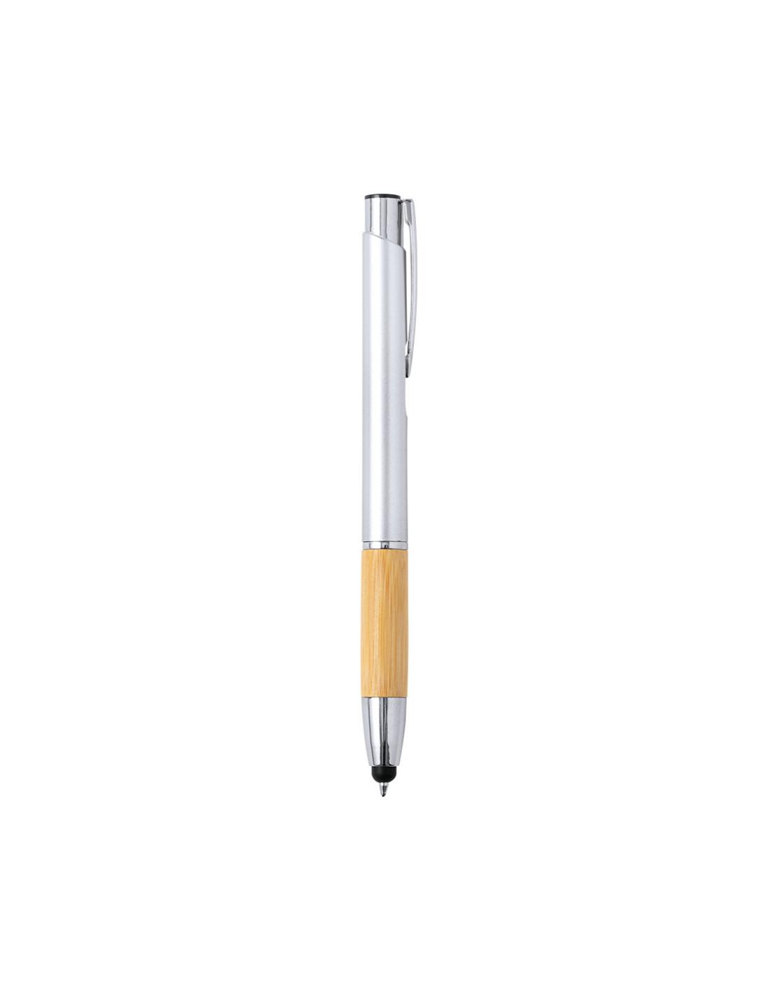 Elegante bolígrafo puntero de línea nature y mecanismo pulsador. Cuerpo en resistente ABS de acabado brillo y empuñadura en bambú, con accesorios a juego. Clip metálico, con cartucho jumbo y en tinta azul.
