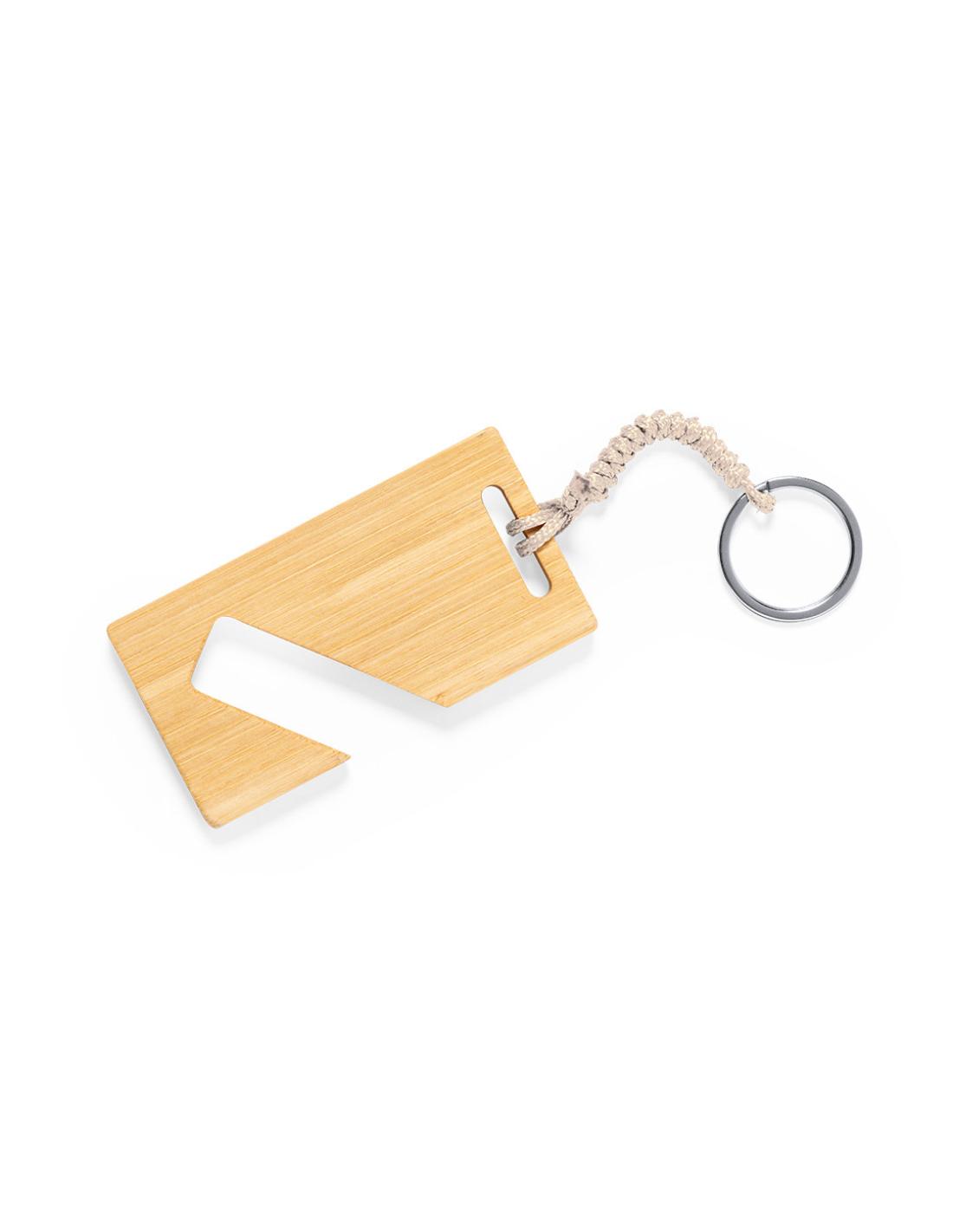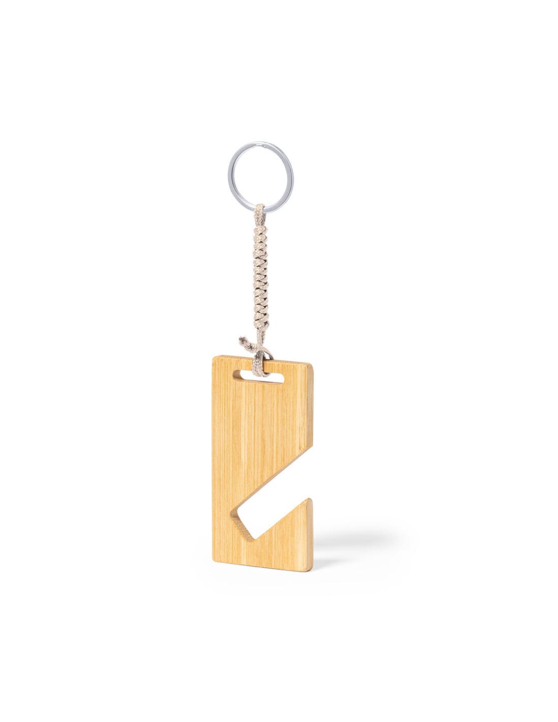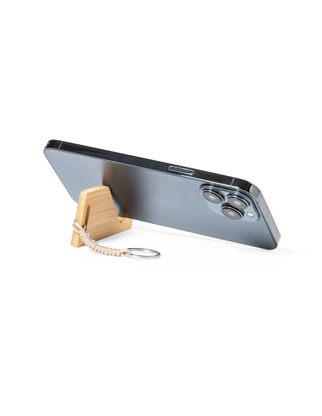 Llavero de línea nature fabricado en bambú, con soporte para smartphone integrado y original cordón. Presentado en bolsita individual con cartón interior eco.
