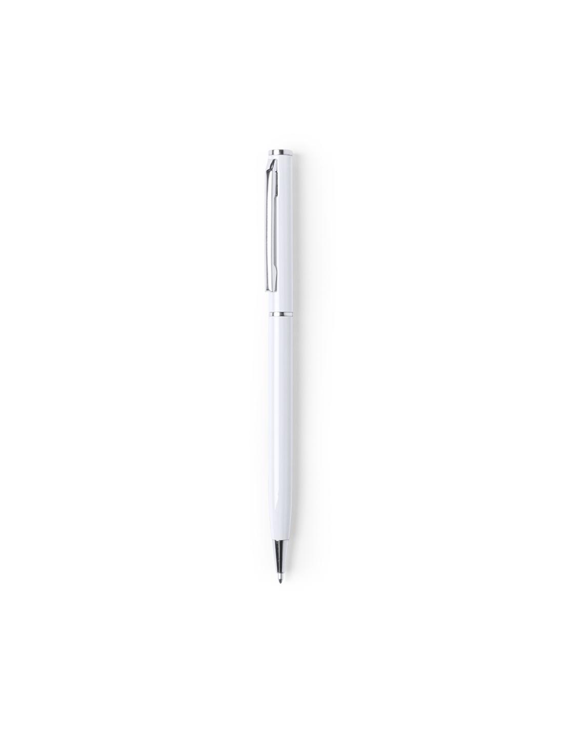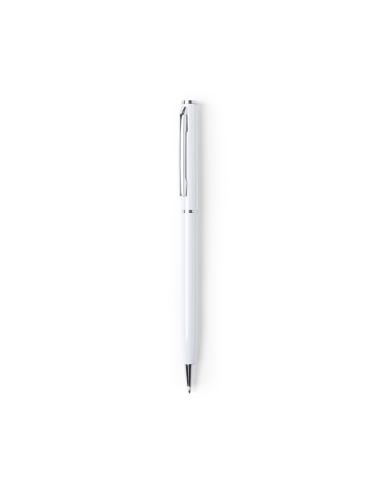 Bolígrafo fabricado en aluminio, de acabado brillo y mecanismo giratorio, con accesorios y anillas en cromado. Disponible en extensa gama de colores, con tinta azul.