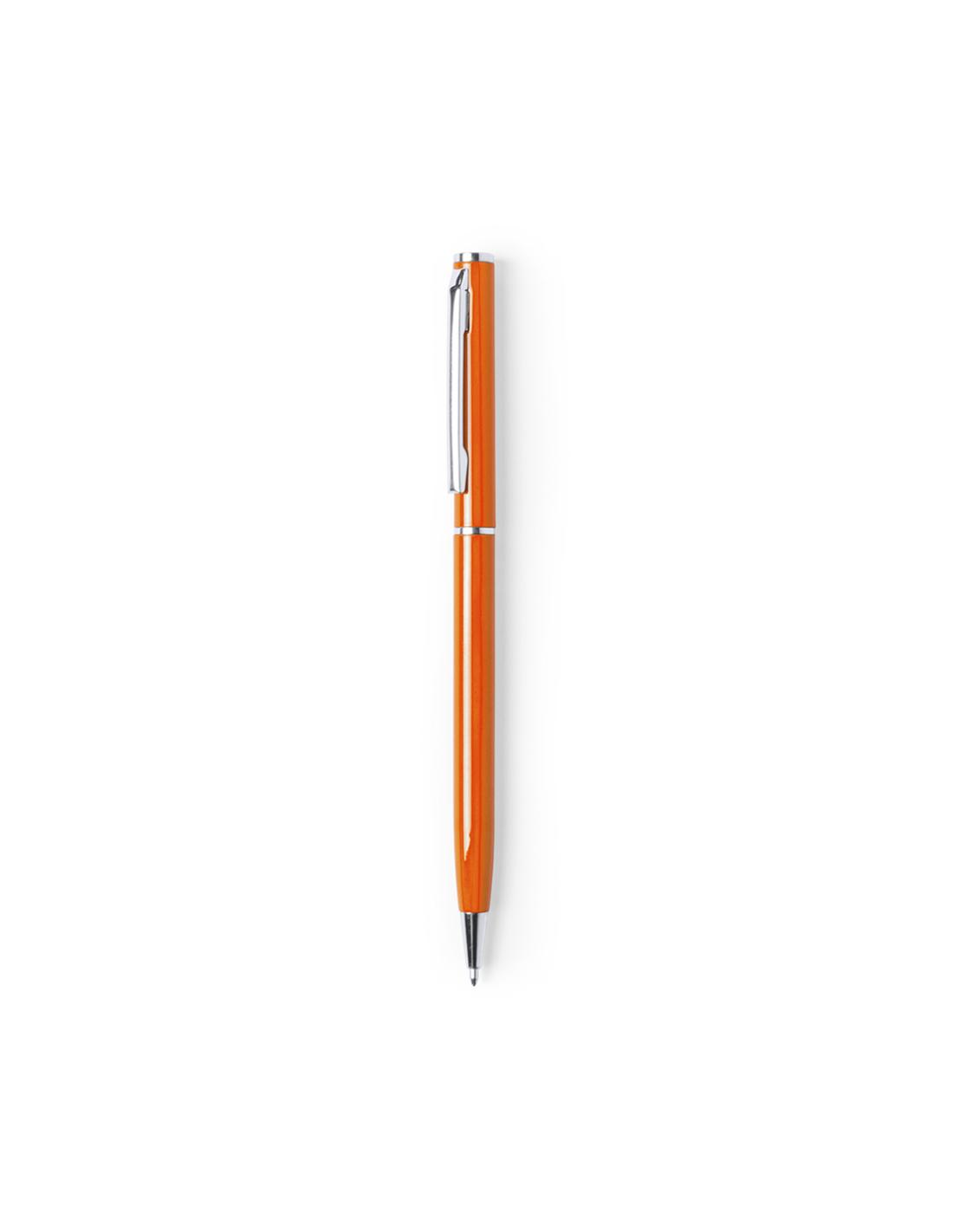 Bolígrafo fabricado en aluminio, de acabado brillo y mecanismo giratorio, con accesorios y anillas en cromado. Disponible en extensa gama de colores, con tinta azul.