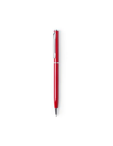 Bolígrafo fabricado en aluminio, de acabado brillo y mecanismo giratorio, con accesorios y anillas en cromado. Disponible en extensa gama de colores, con tinta azul.