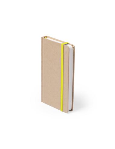 Bloc de notas con tapas de suave tacto acabadas en resistente cartón natural. De 100 hojas lisas, con elástico de sujeción y marcapáginas de tela a juego.