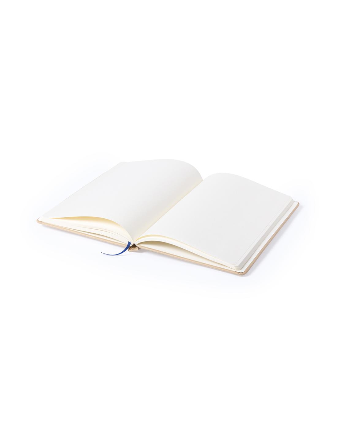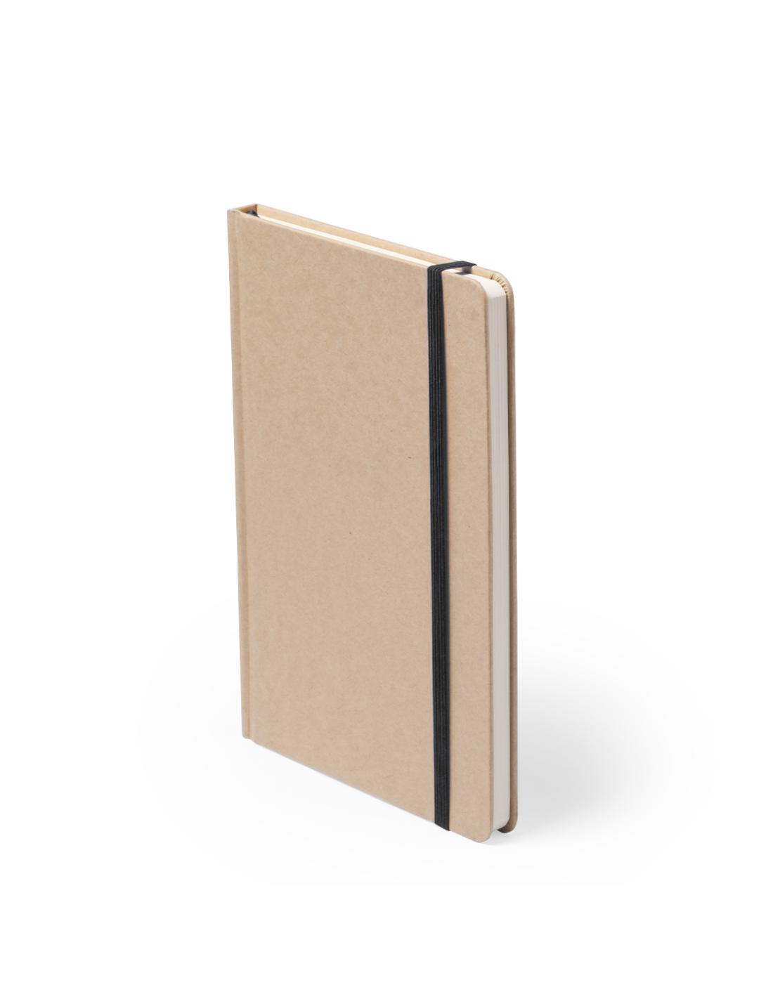 Bloc de notas A5 con tapas duras en resistente cartón reciclado. De 100 hojas blancas lisas y banda elástica para su cierre. Disponible en variada gama de colores.