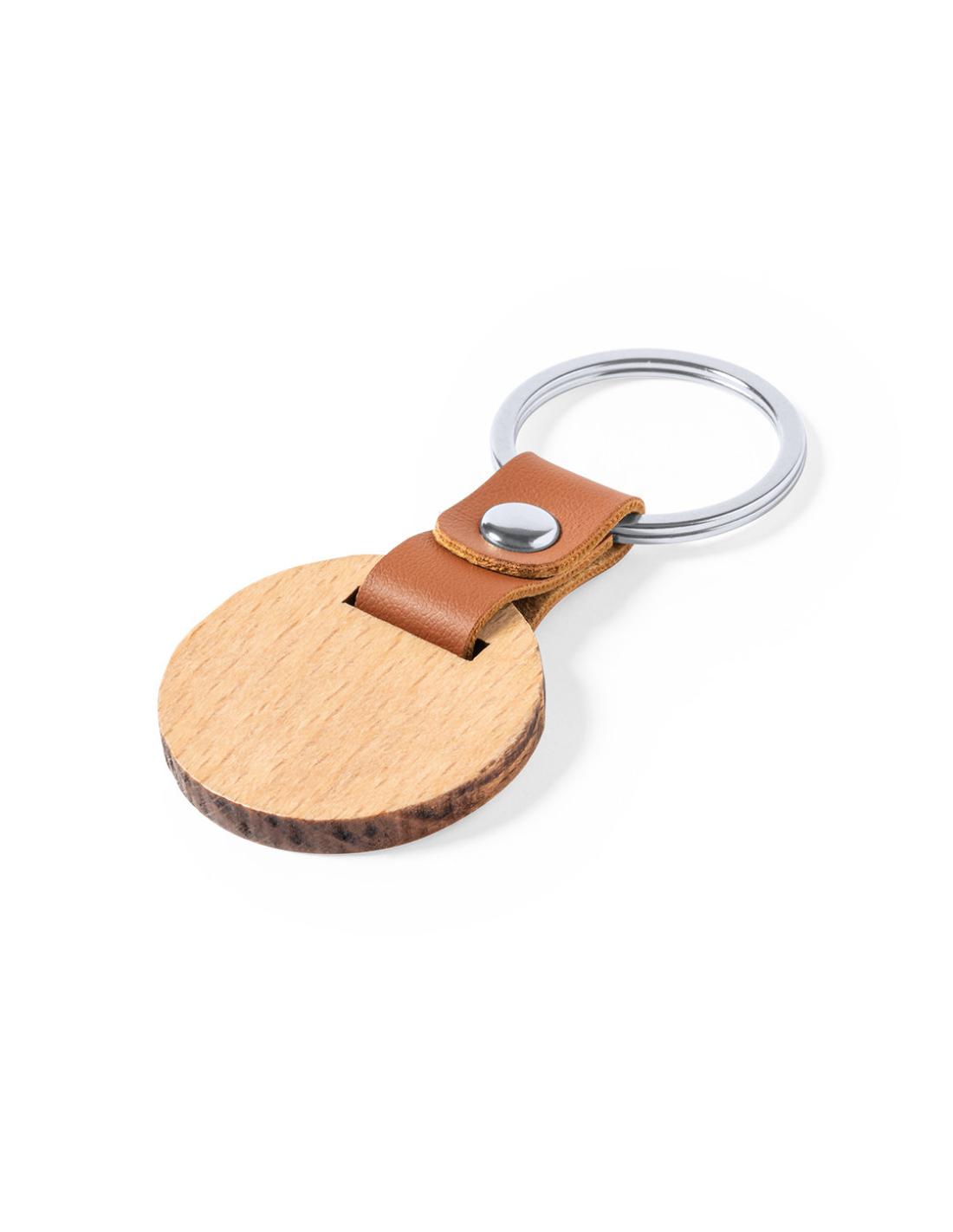 Llavero de línea nature fabricado en madera natural, con original cinta en polipiel marrón y remache cromado. Disponible en diseños rectangular y circular.