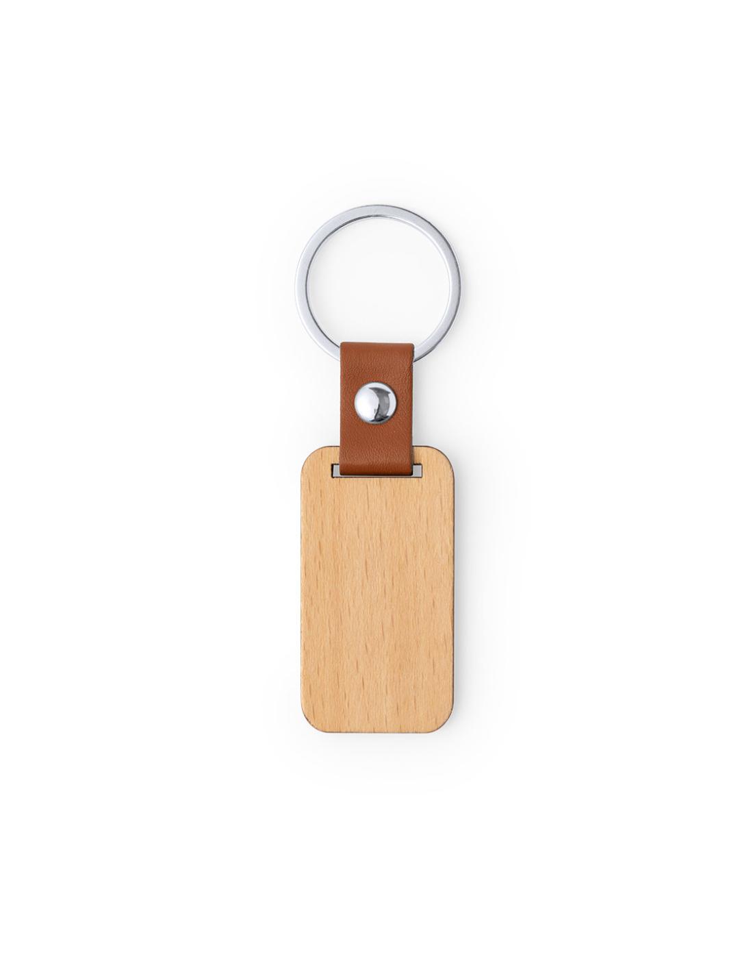 Llavero de línea nature fabricado en madera natural, con original cinta en polipiel marrón y remache cromado. Disponible en diseños rectangular y circular.