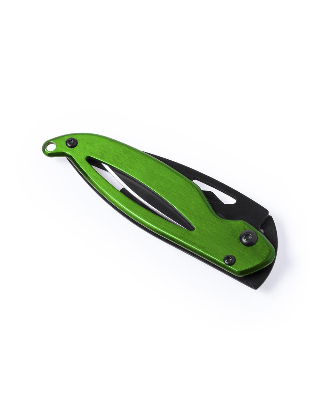 Navaja de alta calidad con hoja en acero inox de color oscuro y empuñadura en acero inox troquelada con bloqueo de seguridad. En variada gama de vivos colores y presentada en caja individual.