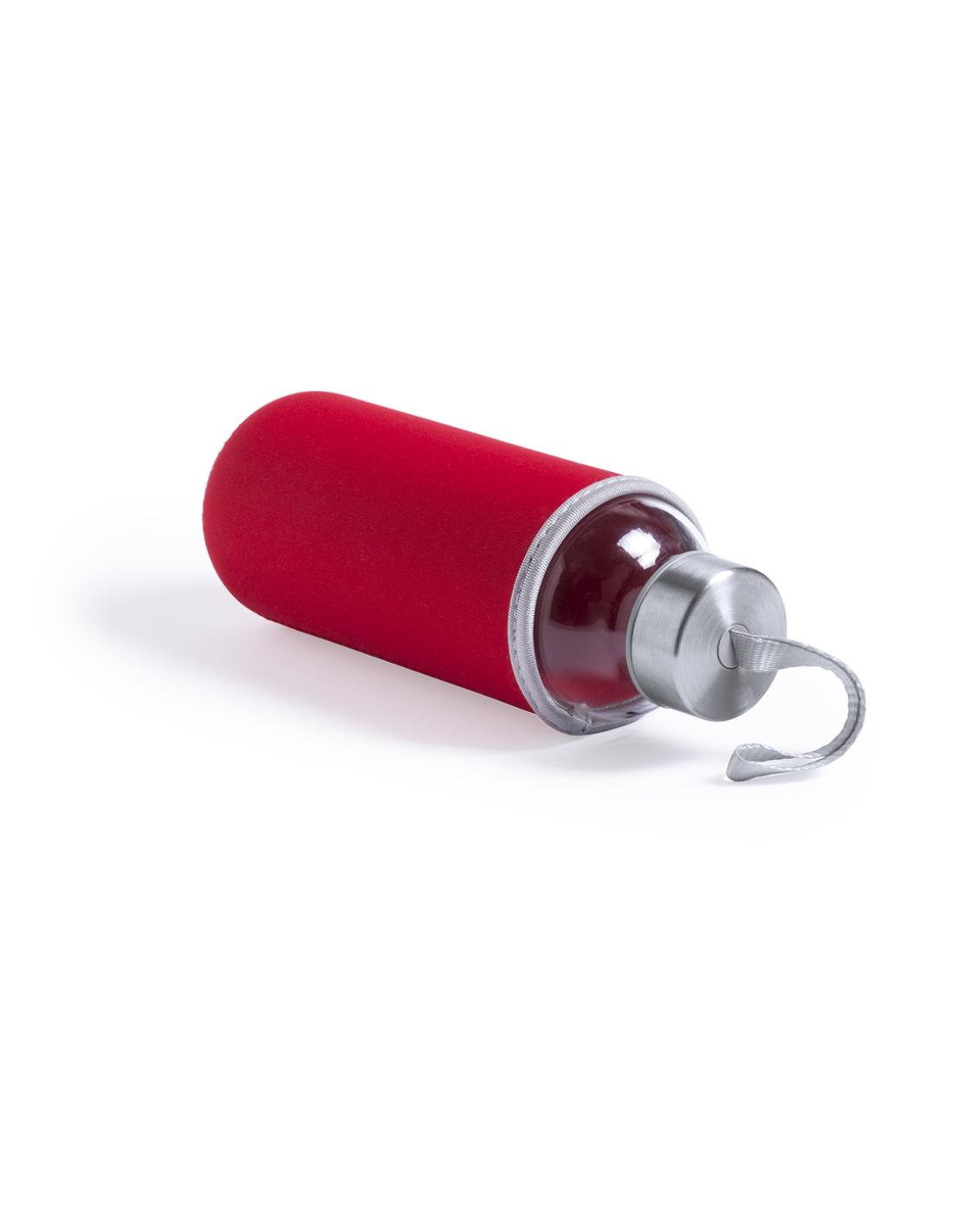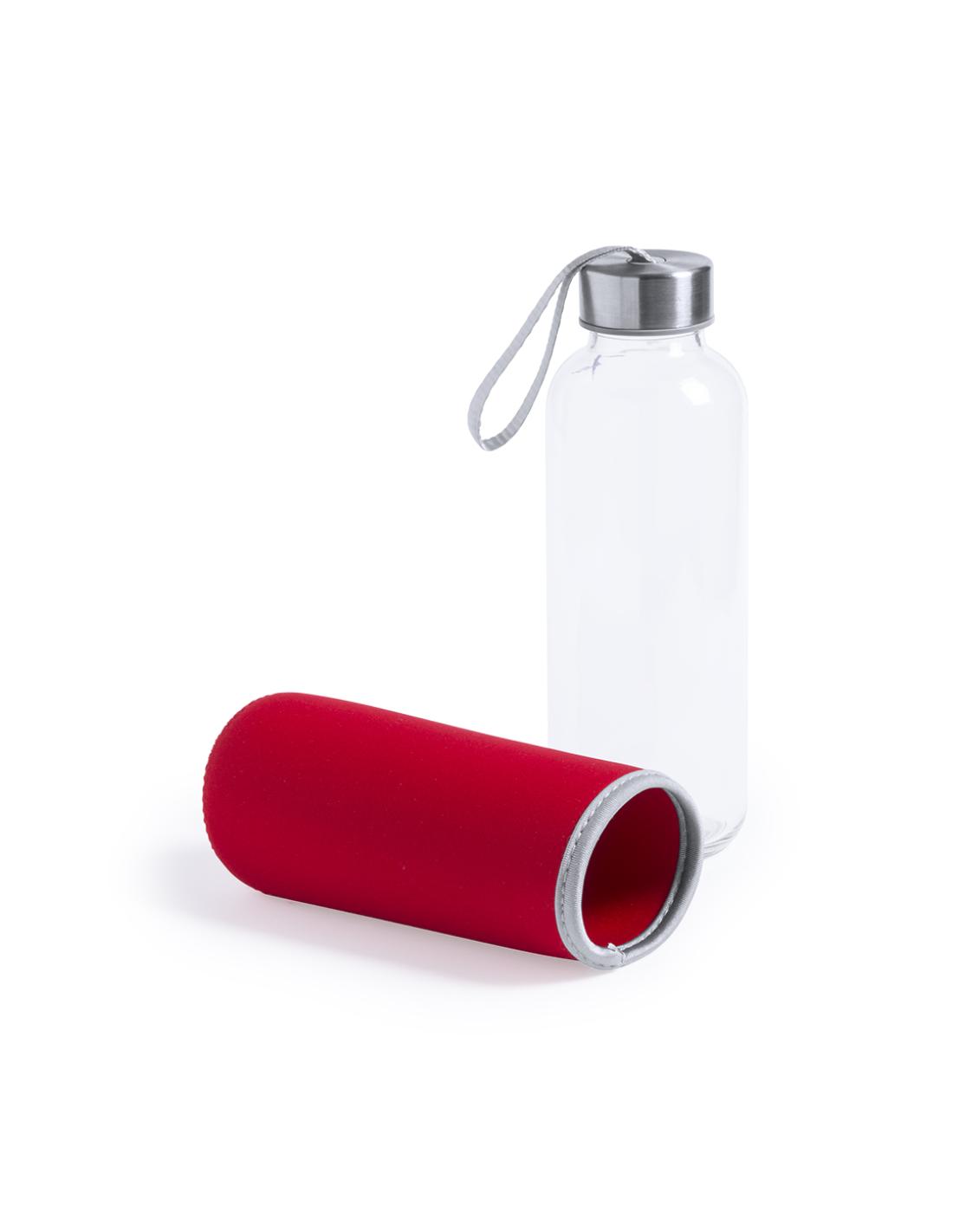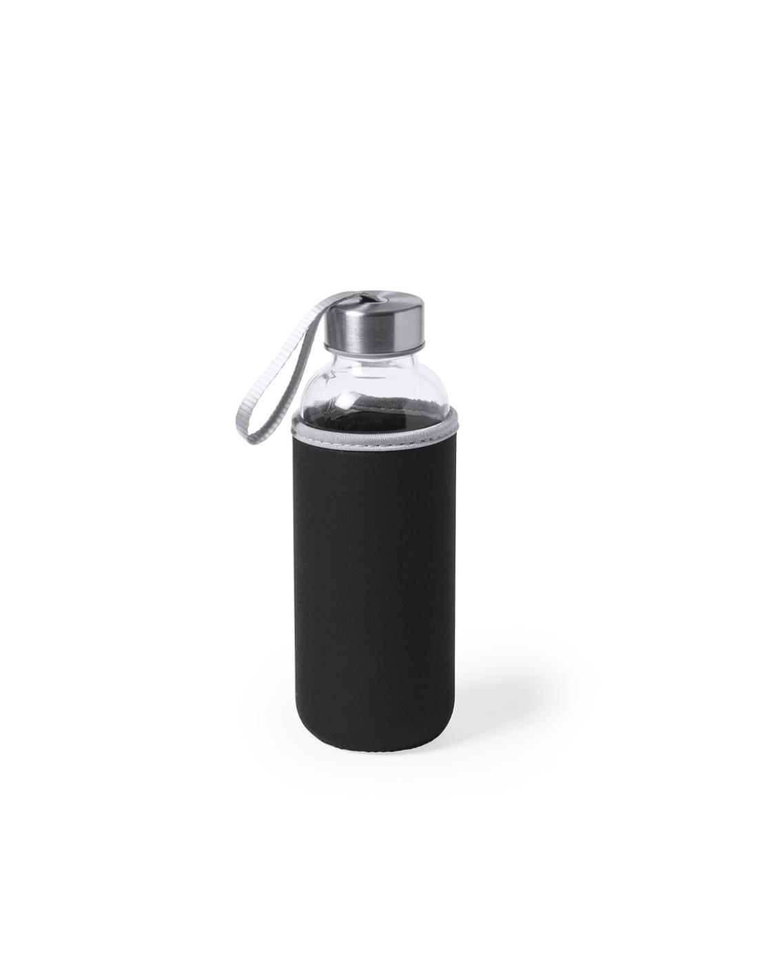 Bidón de cristal de 420 ml de capacidad. Con tapón de seguridad a rosca y practica cinta de transporte, cuenta con una elegante funda de neopreno en vivos colores. Presentado individualmente en una caja de diseño.