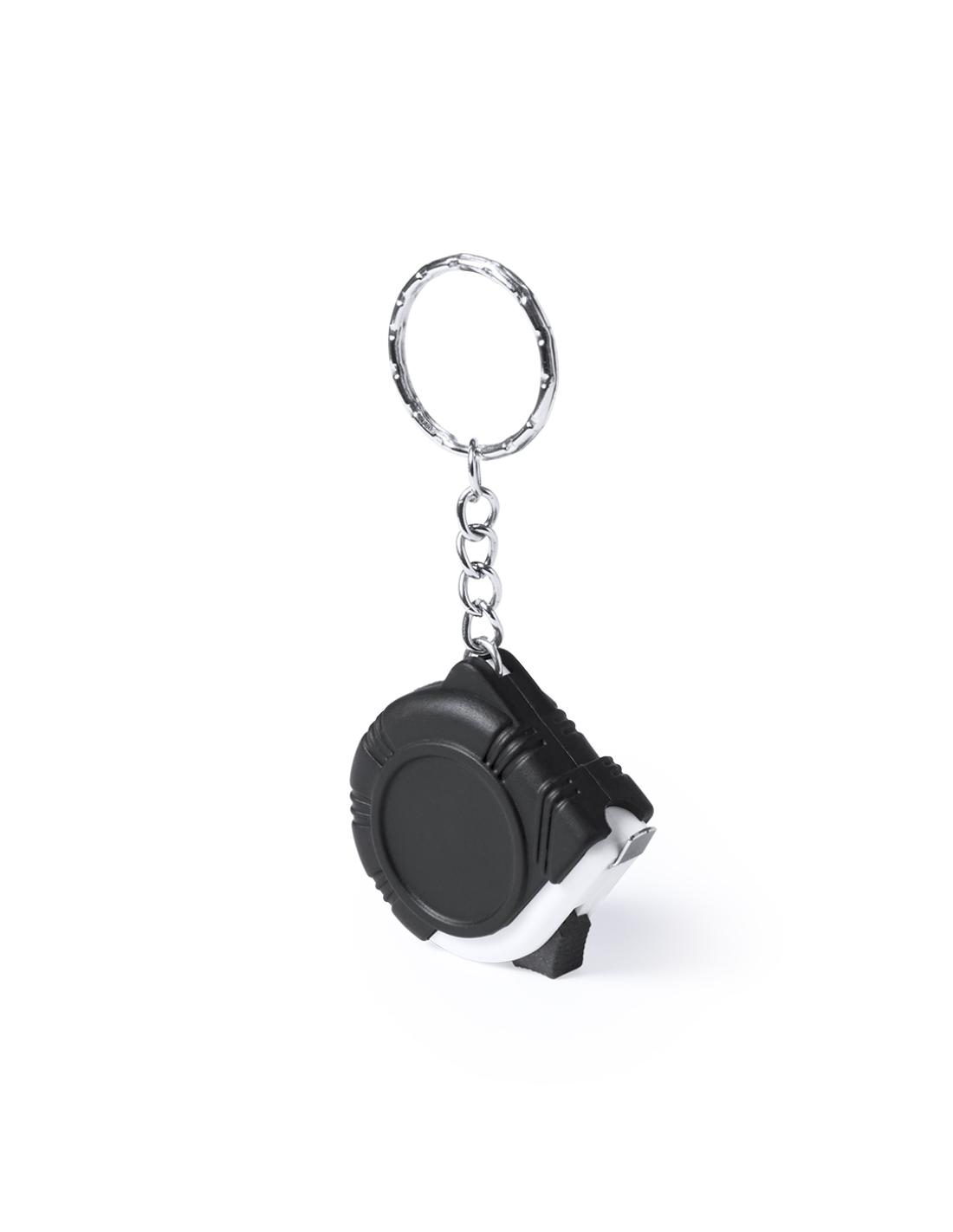 Flexómetro llavero de 1 metro con cuchilla metálica y mecanismo de bloqueo. Medidas en centímetros, pulgadas y pies. Con troquelado especial para marcaje.