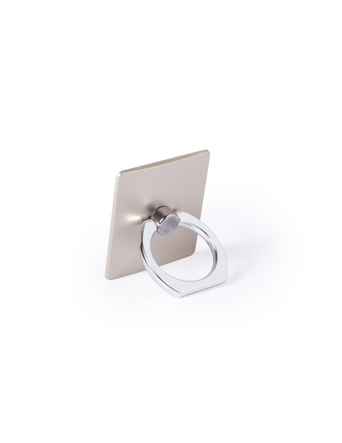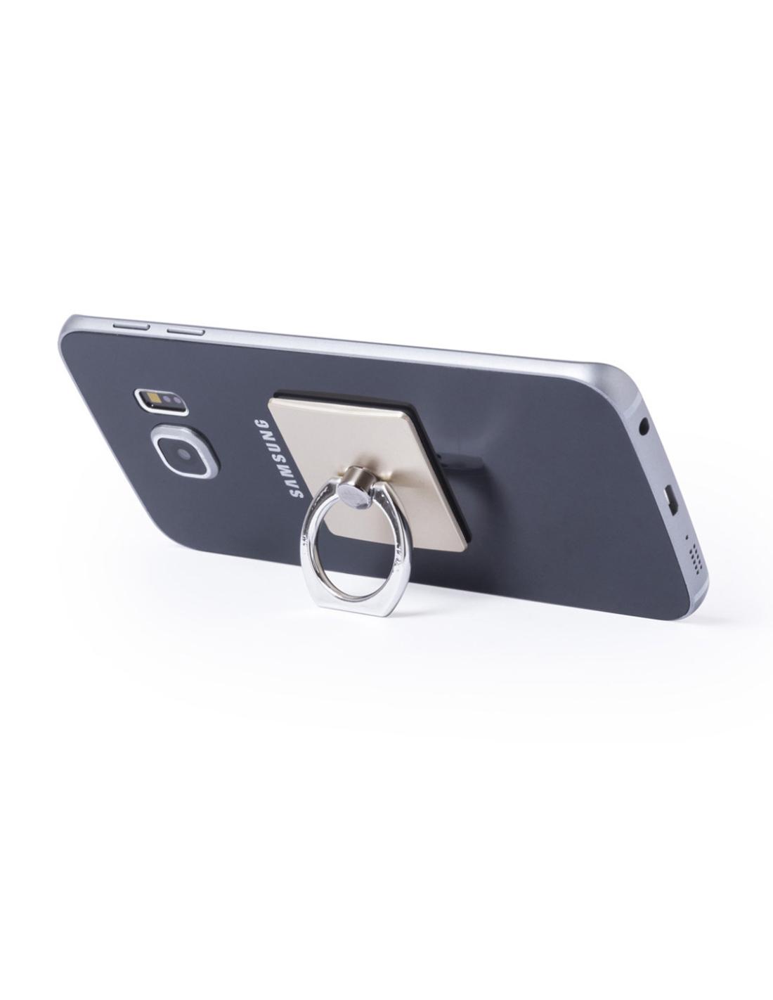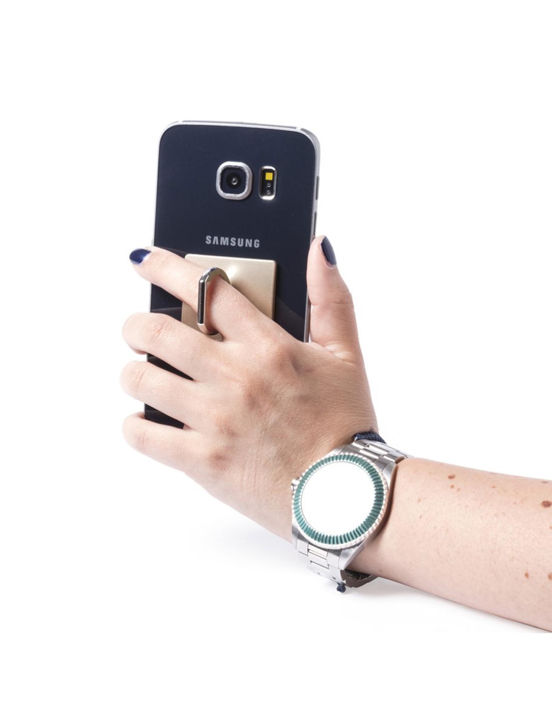 Soporte adhesivo para smartphone de diseño minimalista y elegante acabado en plateado y dorado. Con anilla posterior telescópica para dedo con función doble de soporte y accesorio para selfies.