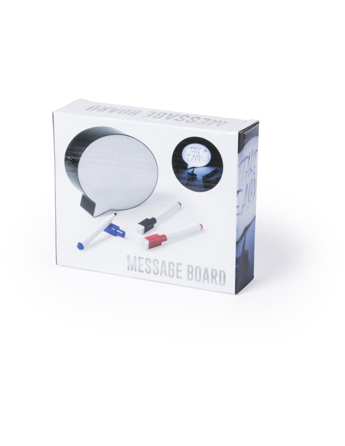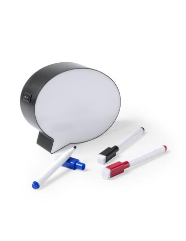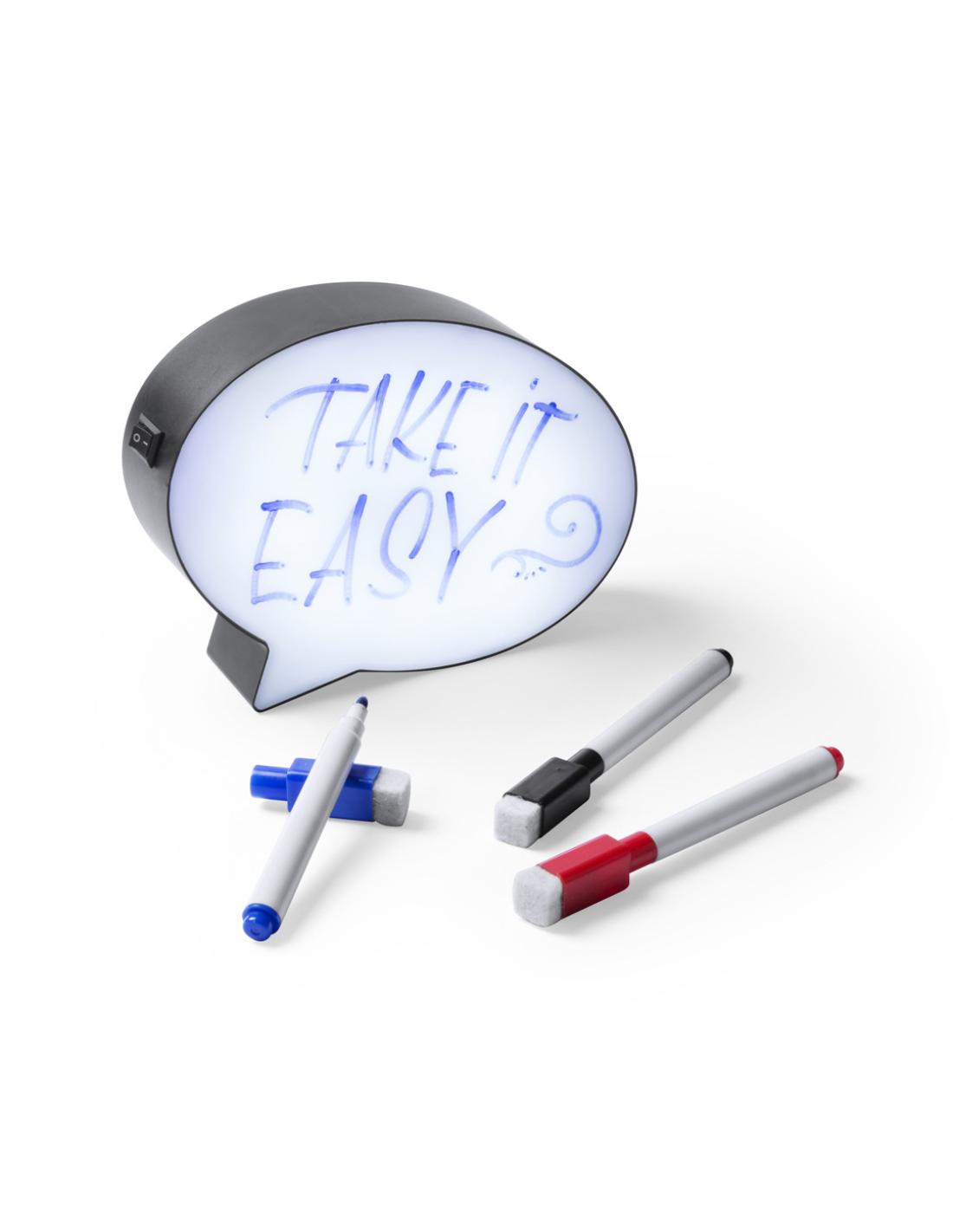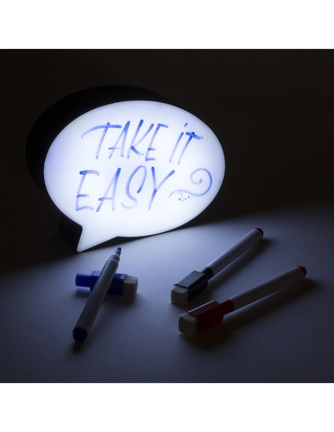 Divertida pizarra bocadillo con interior iluminado por 8 ledes. Con botón ON/OFF y tres rotuladores con borrador en colores azul, negro y rojo incluidos. Alimentación a pilas: 3xAAA no incluidas y presentada en atractiva caja de diseño.