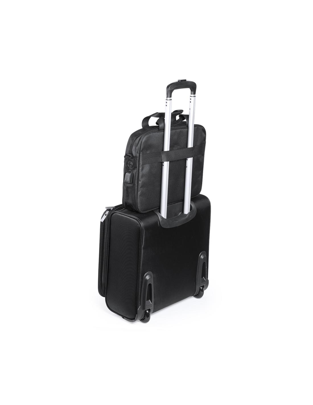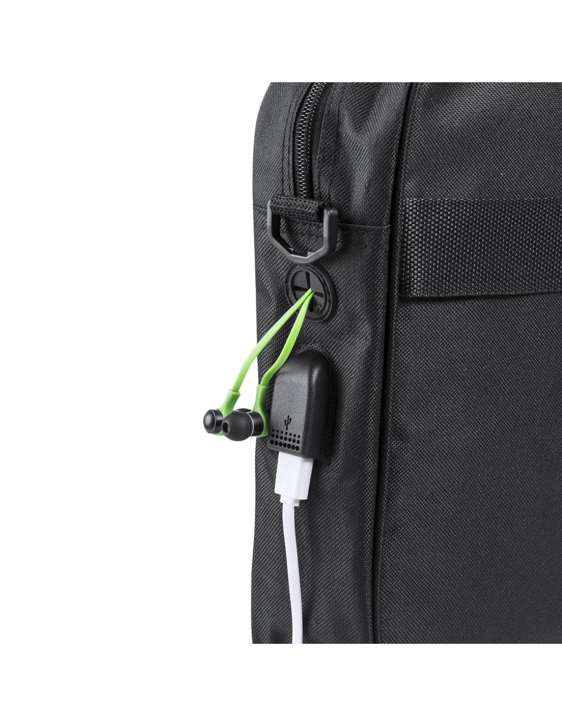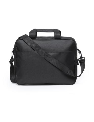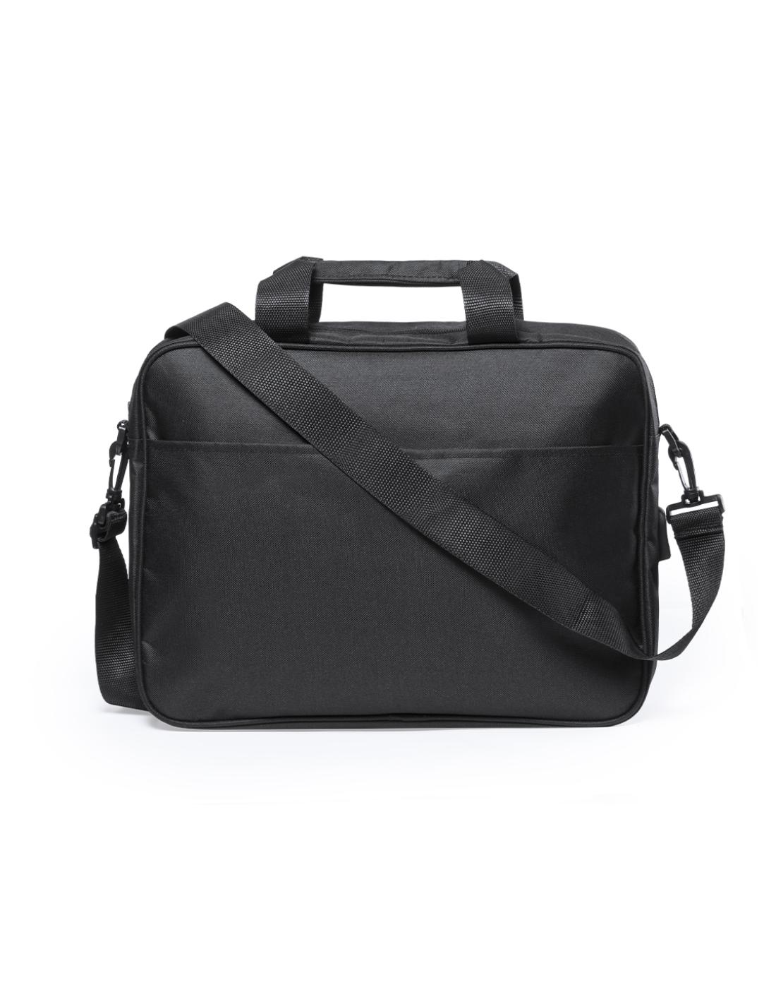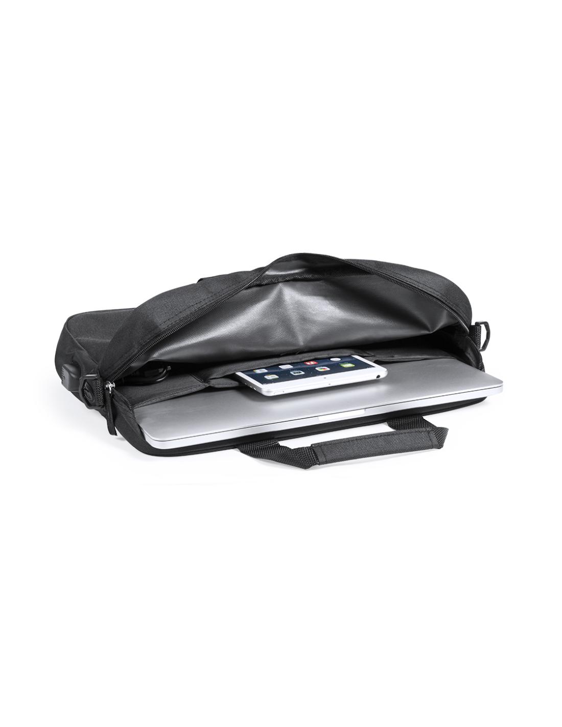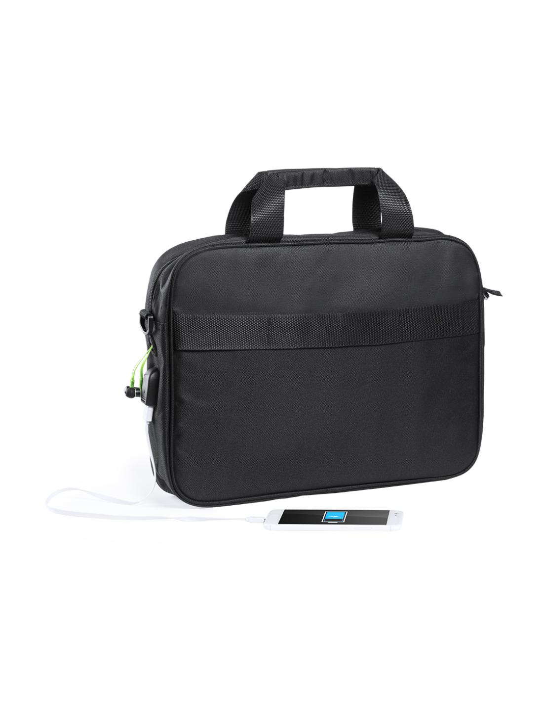Portadocumentos en resistente poliéster 600D de acabado en color negro y de cierre de cremallera. Con salida para auriculares y compartimento interior con salida USB para conexión de powerbank -no incluido-. Con resistentes asas reforzadas y accesorio en la parte posterior para acople en barra de trolley. Interior con compartimento acolchado para ordenador portátil de hasta 15 pulgadas y compartimento para tablet de hasta 10 pulgadas. Con Multitud de bolsillos interiores y exteriores y cinta bandolera ajustable con cierre de mosquetón.