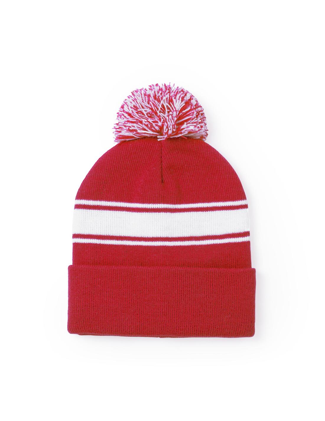 Suave y cálido gorro de material acrílico en variada gama de colores. De original diseño, con tira frontal de color blanco y pom pom bicolor a juego.