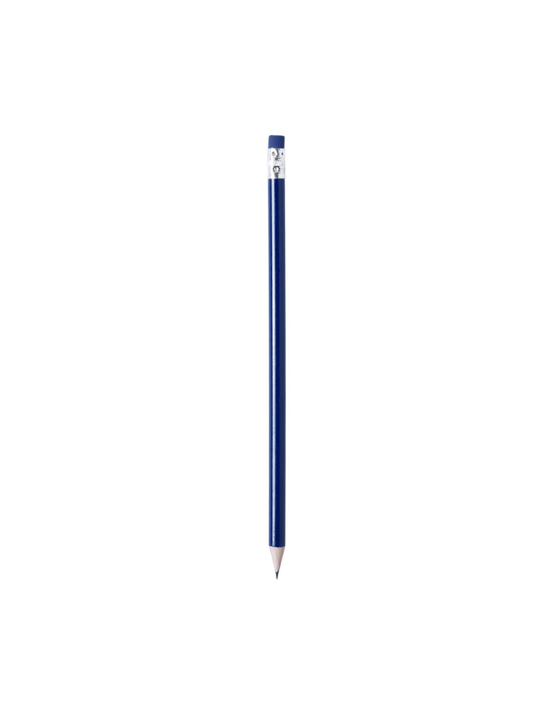Lápiz de madera de acabado brillo. Con cuerpo redondo y goma de borrar a juego. Disponible en variada gama de colores. Mina negra y punta afilada.