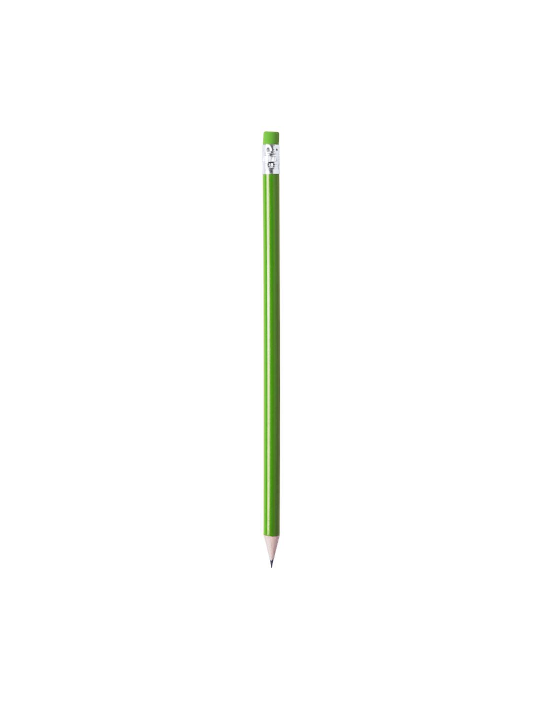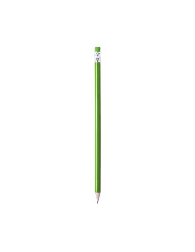 Lápiz de madera de acabado brillo. Con cuerpo redondo y goma de borrar a juego. Disponible en variada gama de colores. Mina negra y punta afilada.