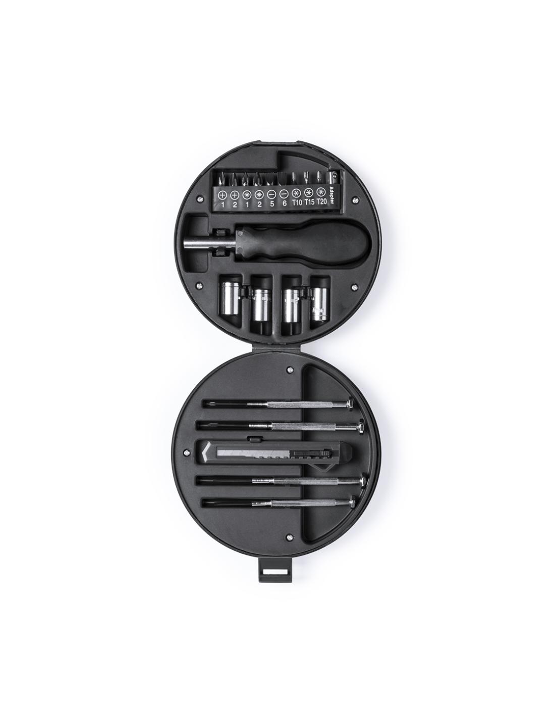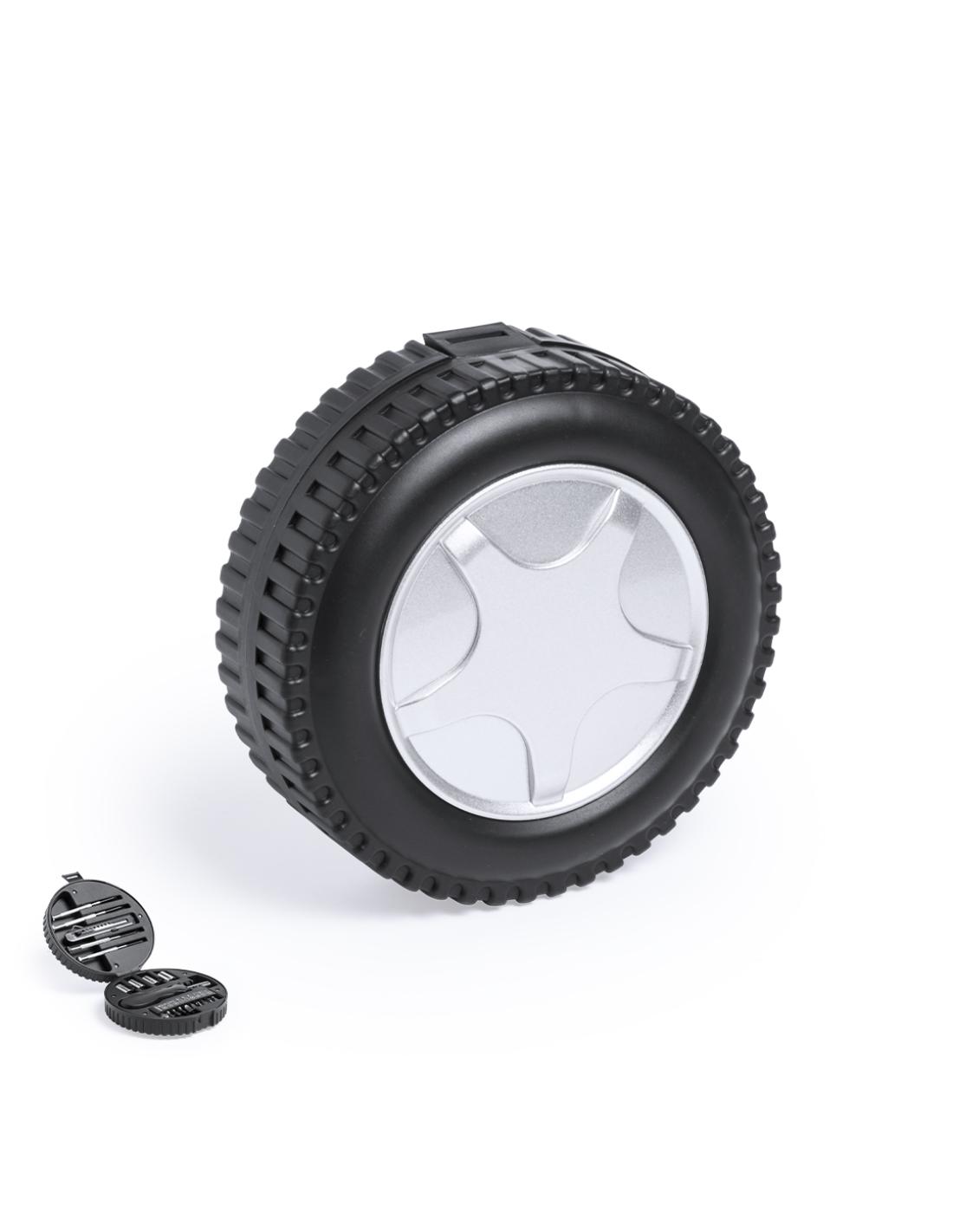 Set de herramientas de 20 accesorios en resistente estuche con diseño de rueda. Incluye set de destornilladores de precisión, herramienta de fijación, cabezales destornilladores planos y de estrella, llaves para tuercas de cabeza hexagonal y cutter. Presentado en caja individual.
