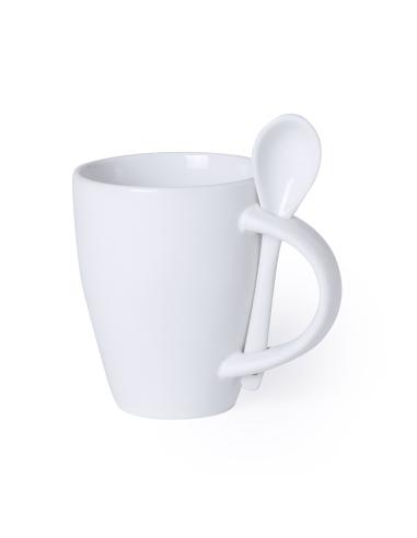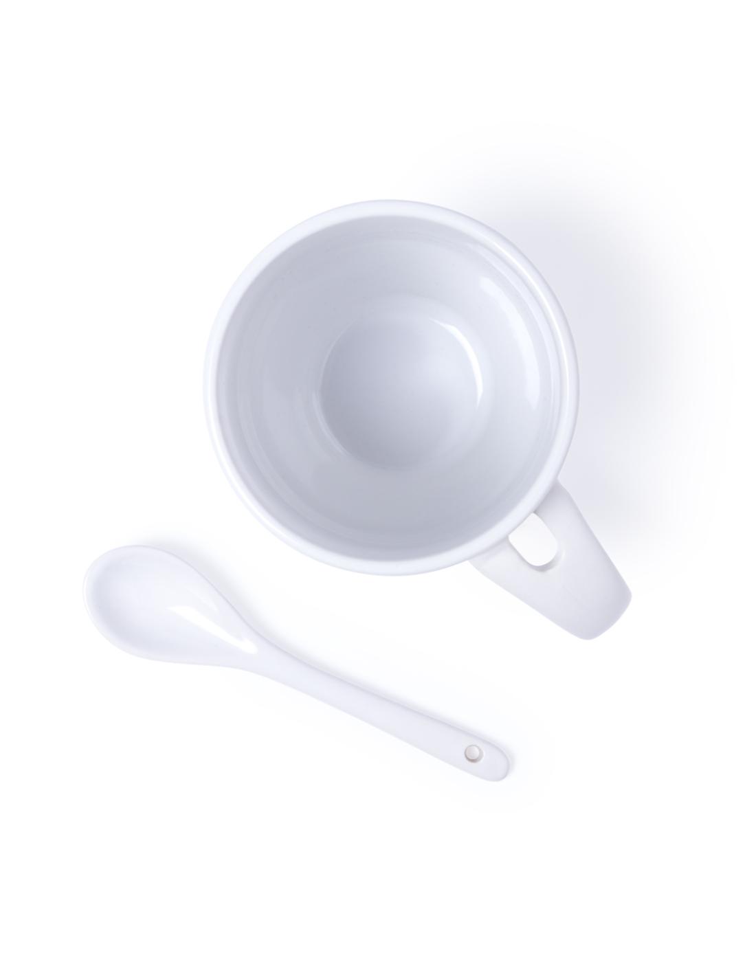 Taza de cerámica de 300ml de capacidad en color blanco. Con cuchara de cerámica a juego integrada en asa y presentada en caja individual.Disponible manual de instrucciones en español e inglés.