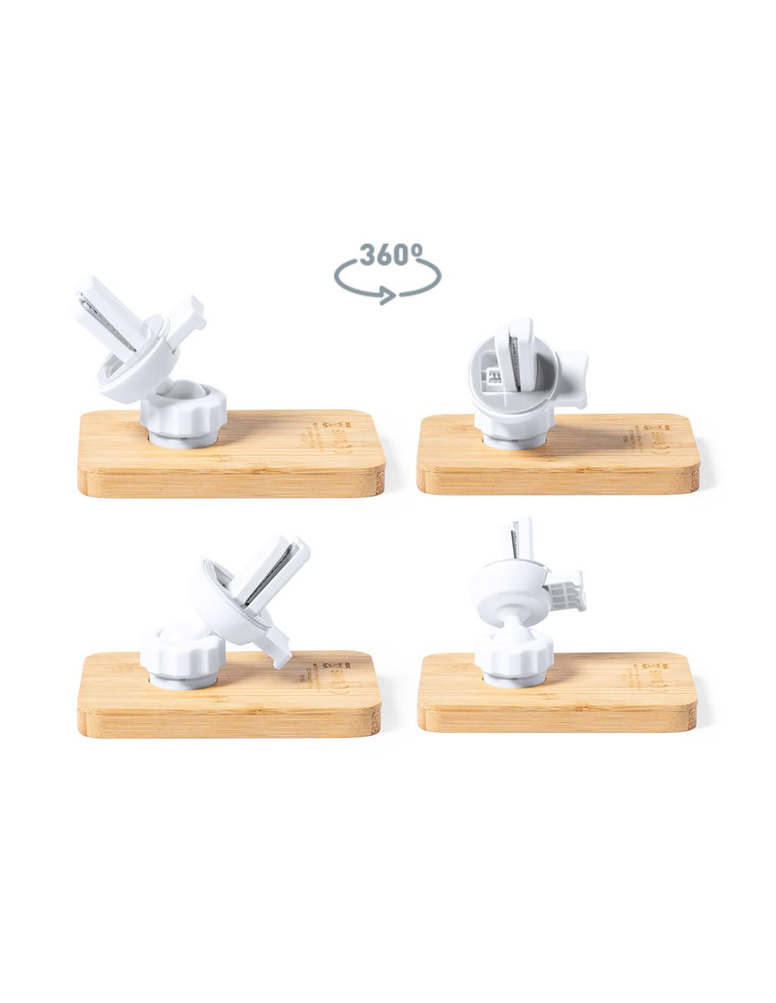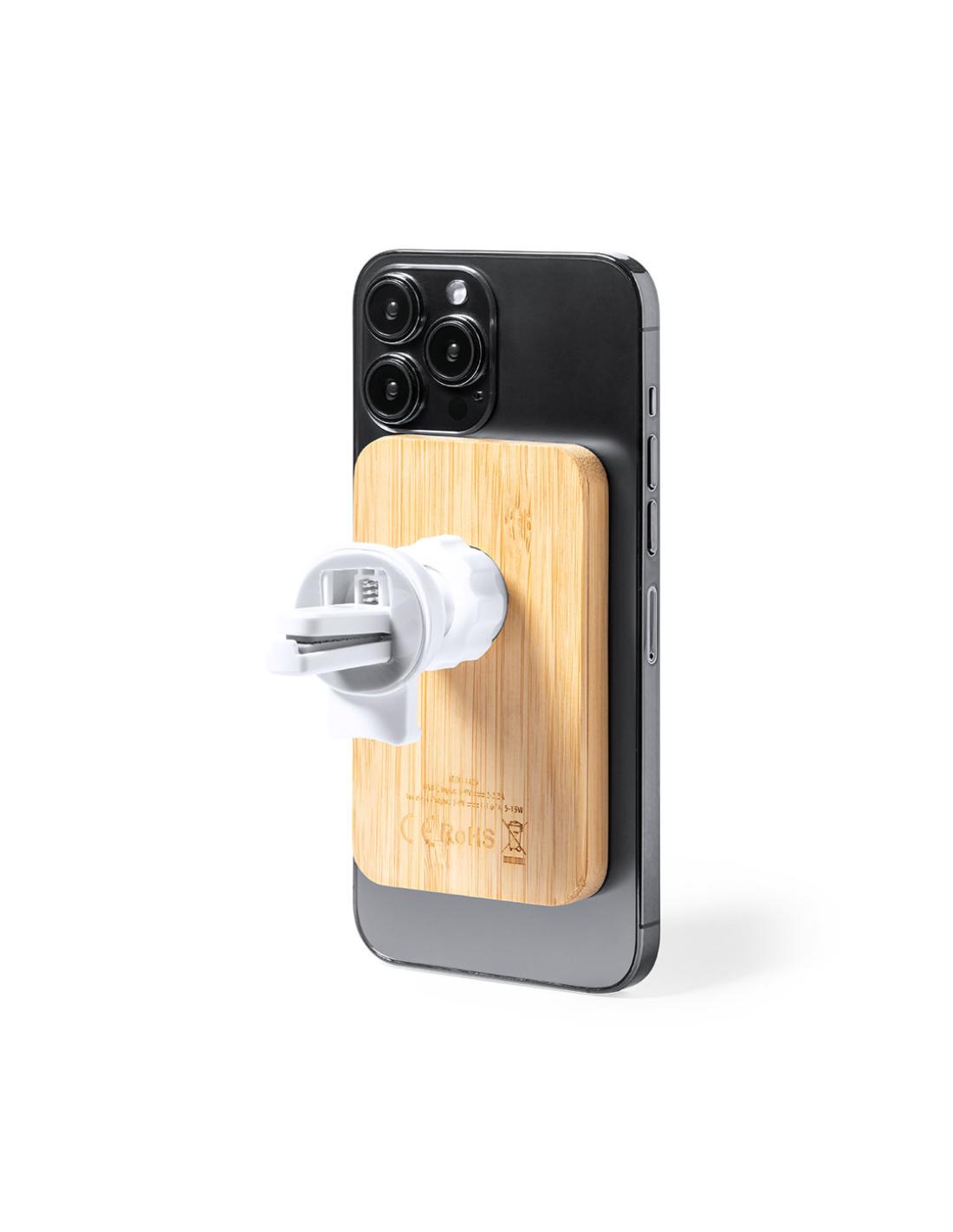 Soporte de rejilla de coche para smartphone de línea nature y fabricado en bambú. Con cargador inalámbrico 15W integrado y fijación magnética para poder usar el dispositivo mientras se está cargando. Incluye anillo adhesivo, siendo válido para todos los dispositivos con tecnología Magsafe y Qi. Presentado en caja individual de diseño eco en cartón kraft.