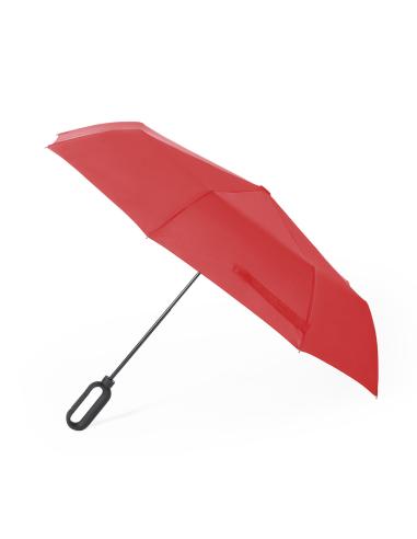 Paraguas plegable de 8 paneles en variada gama de colores. De 100cm de diámetro, apertura manual, con sistema antiviento y en resistente material pongee. Con varillas de fibra en color negro, cierre de velcro y mango ergonómico con mosquetón de enganche integrado. Presentado en funda individual a juego.