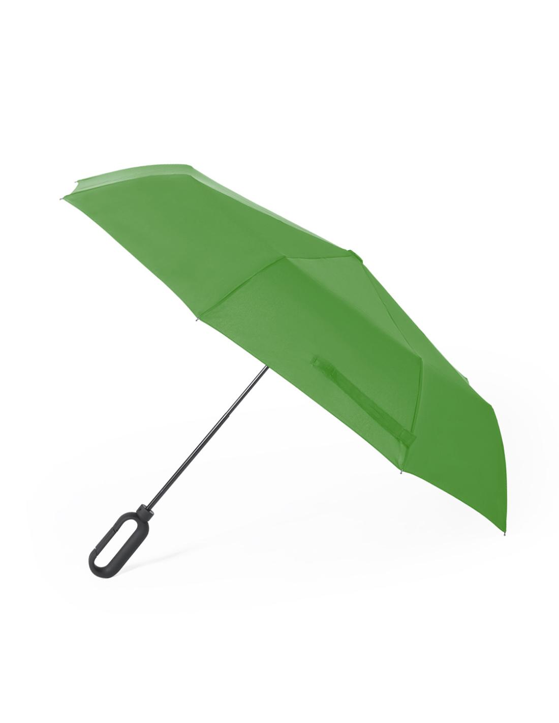 Paraguas plegable de 8 paneles en variada gama de colores. De 100cm de diámetro, apertura manual, con sistema antiviento y en resistente material pongee. Con varillas de fibra en color negro, cierre de velcro y mango ergonómico con mosquetón de enganche integrado. Presentado en funda individual a juego.