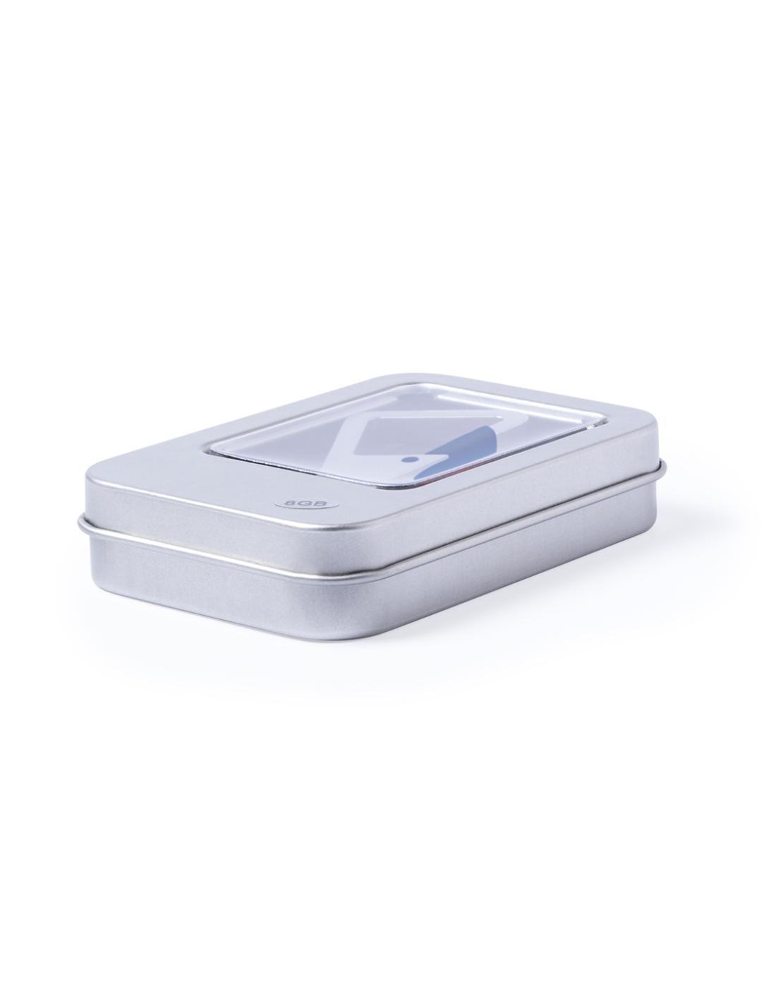Memoria USB de 8GB de capacidad de acabado metálico y con original diseño de mosquetón con cierre en variada gama de colores. Presentada en estuche metálico individual con ventana e interior troquelado en suave espuma.