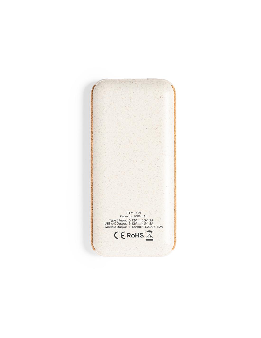 Batería auxiliar externa de línea nature, fabricada en combinación de corcho natural y caña de trigo. De 8.000 mAh de capacidad de carga-. Con cargador inalámbrico integrado 15W, con conector de entrada/salida Tipo C + salida USB. Presentada en caja individual de diseño eco en cartón kraft. Las capacidades mostradas en todas nuestras baterías auxiliares externas son reales, incorporando todas ellas baterías de grado A y no recicladas, con una vida útil de al menos 500 ciclos de carga y según normativa CE. Además, están fabricadas conforme a los estándares RoHS y en cumplimiento con los siguientes requisitos de seguridad: Sistema de protección contra sobrecarga del power bank. Sistema de protección contra descarga completa que proporciona una mayor durabilidad del power bank. Sistema de bloqueo para evitar...
